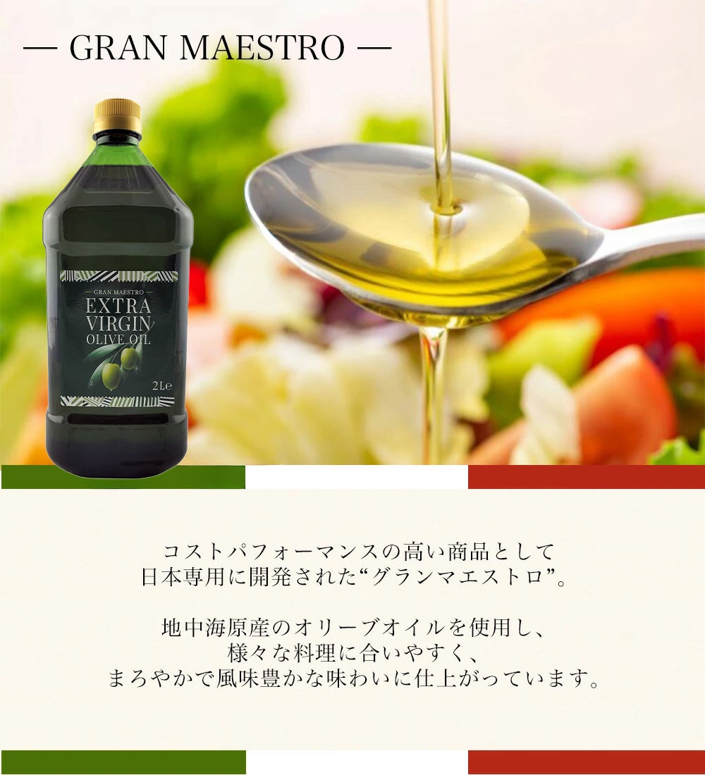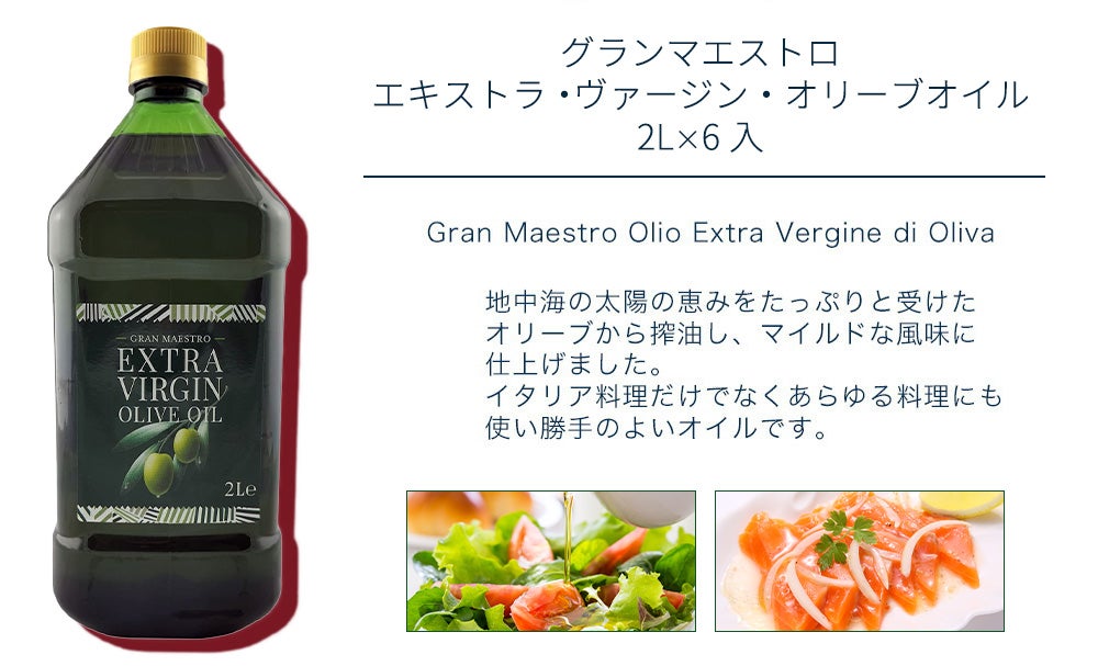 他の画像を見る 【取り寄せ】【送料無料】【2L(2,000ml)×6本】グランマエストロ・EV・エキストラ・ヴァージン・オリーブ・オイル・2L(2,000ml)×6本 当店特別価格 ¥ 25,680 税込 カートに入れる お気に入りに登録する