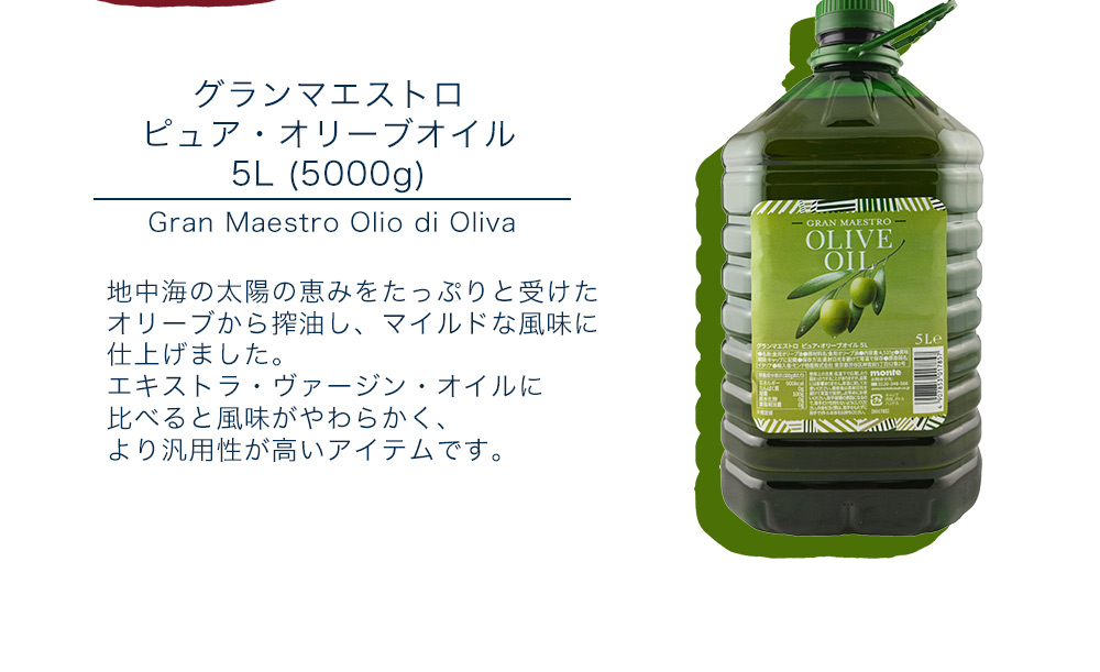 【商品説明】日本専用に開発、マイルドな風味!!コストパフォーマンスの高い商品として日本専用に開発されたピュア・オリーブオイル!!地中海の太陽の恵みをたっぷりと受けたオリーブから搾油し、マイルドな風味に仕上げました!!エキストラ・ヴァージン・オイルに比べると風味がやわらかく、より汎用性が高いアイテムです!イタリア料理だけでなくあらゆる料理にも使い勝手のよいオイルです!!すべてのお料理にお使いただけますが、サラダやマリネなどにお使いいただくと、豊かな香りとフルーティな味わいをお楽しみいただけます!!