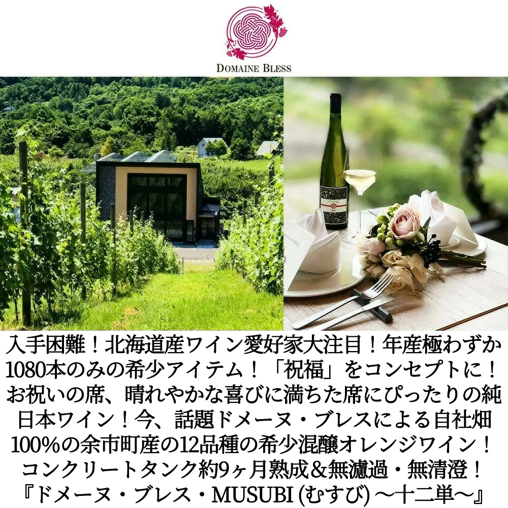 入手困難!北海道産ワイン愛好家大注目!年産僅か1080本のみの希少アイテム!お祝いの席、晴れやかな喜びに満ちた席にぴったりの純日本産ワイン!日本ワイナリーアワード4ッ星ドメーヌ!「夢」を叶え、「祝福」への道を歩む日本が世界に誇れる新たなスター生産者ドメーヌ・ブレスによる余市町産の12品種の混醸オレンジワイン!MUSUBI(むすび)-十二単-が遂に待望入荷!
