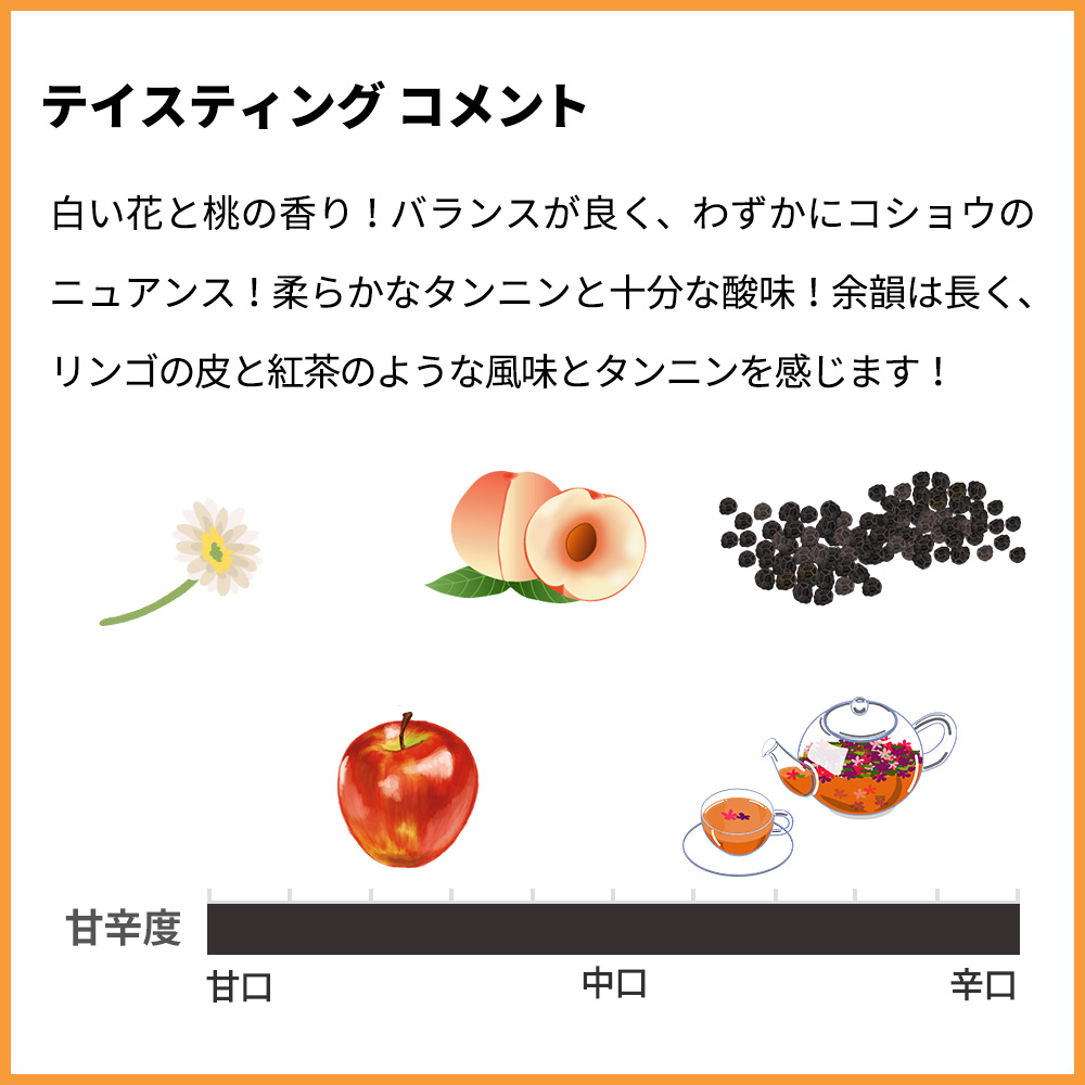 白い花と桃の香り!バランスが良く、わずかにコショウのニュアンス!柔らかなタンニンと十分な酸味!余韻は長く、リンゴの皮と紅茶のような風味とタンニンを感じます!