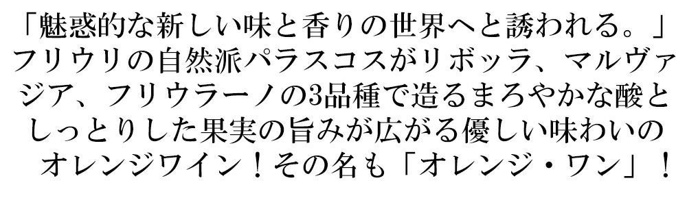 他の画像を見る オレンジ ワン 2021 パラスコス元詰 自然派 ヴァンナ チュール オレンジワイン IGTフリウリ ベネツィア ジューリア ノンフィルター 辛口 白Orange One 2021 Paraschos I.G.T.VENEZIA GIULIA 白ワイン オレンジ イタリア 辛口 当店特別価格 ¥ 3,733 税込 カートに入れる お気に入りに登録する