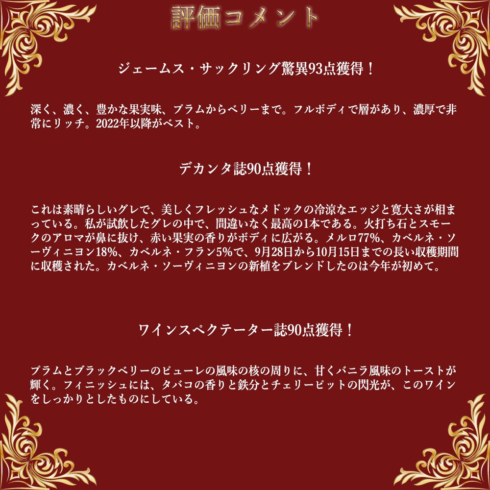 - ブドウ品種メルロー77%、カベルネ・ソーヴィニヨン18%、カベルネ・フラン5%