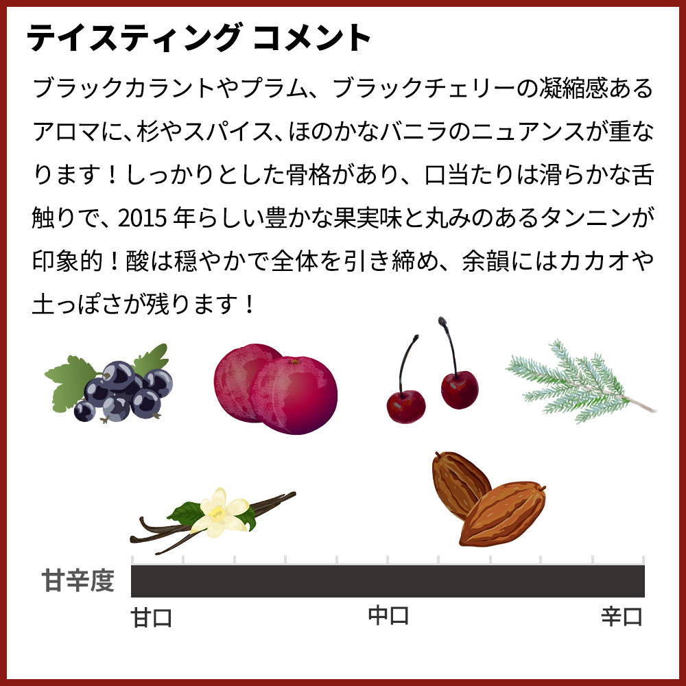 ブラックカラントやプラム、ブラックチェリーの凝縮感あるアロマに、杉やスパイス、ほのかなバニラのニュアンスが重なります!しっかりとした骨格があり、口当たりは滑らかな舌触りで、2015年らしい豊かな果実味と丸みのあるタンニンが印象的!酸は穏やかで全体を引き締め、余韻にはカカオや土っぽさが残ります!