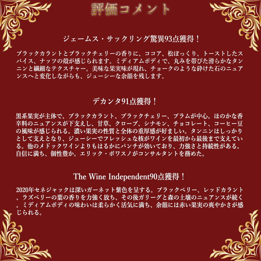 シャトー・セネジャック[2020]年・AOCオー・メドック(旧クリュ・ブルジョワ・シュペリュール)・ジェームス・サックリング驚異93点&デカンタ91点&The Wine Independent90点