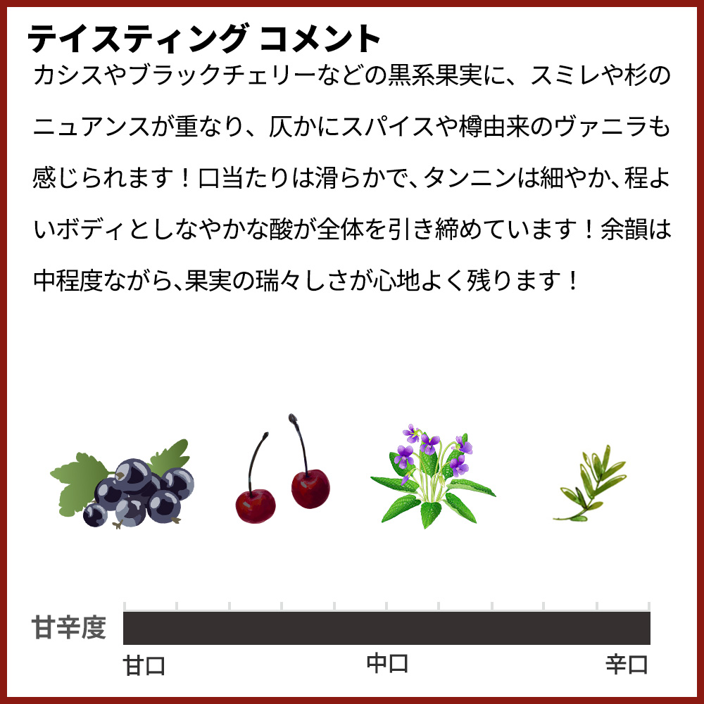カシスやブラックチェリーなどの黒系果実に、スミレや杉のニュアンスが重なり、仄かにスパイスや樽由来のヴァニラも感じられます!口当たりは滑らかで、タンニンは細やか、程よいボディとしなやかな酸が全体を引き締めています!余韻は中程度ながら、果実の瑞々しさが心地よく残ります!若いうちから楽しめる一方で、数年の熟成にも耐える構造を備えた傑作セカンド!