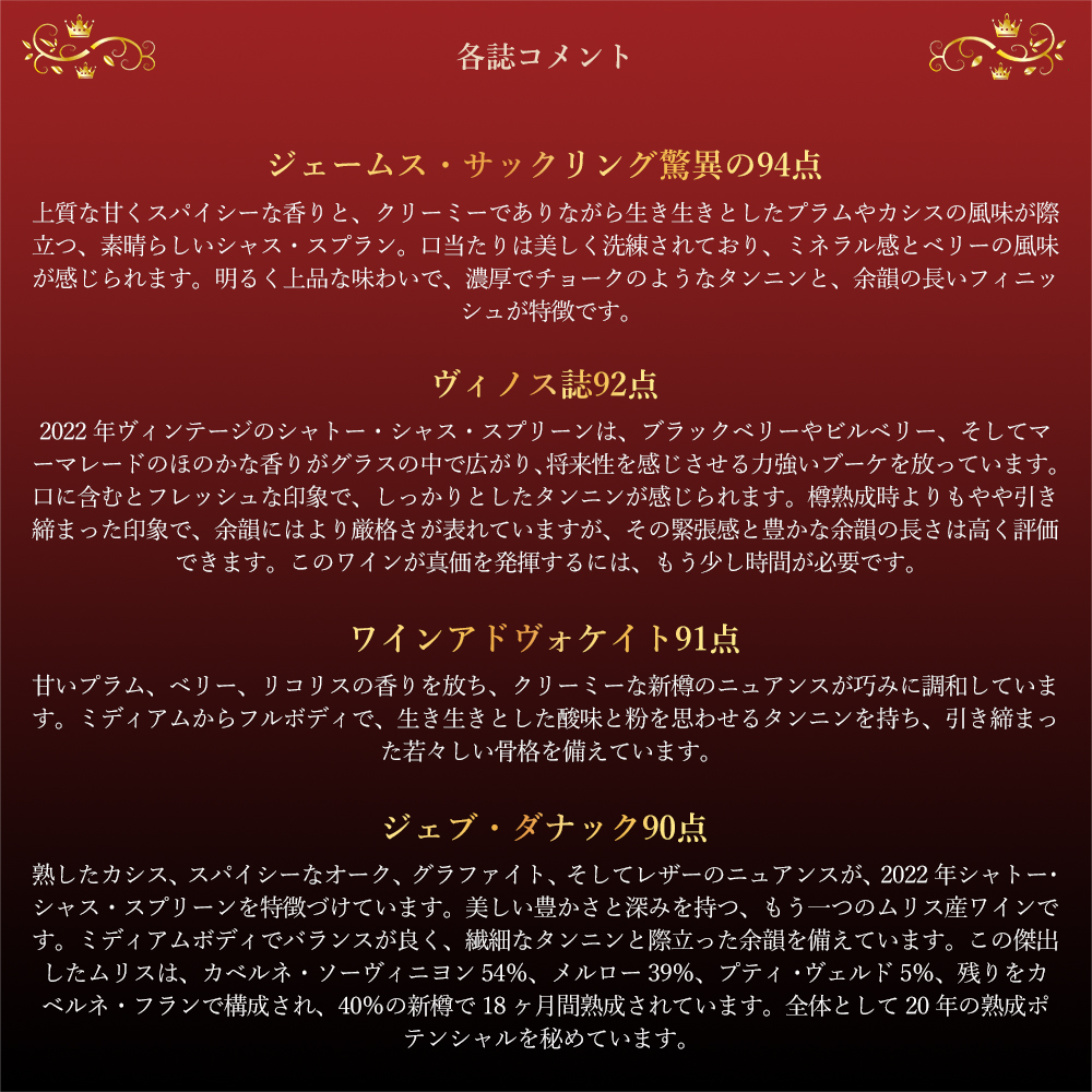 ヴィノス誌92点でコメントは「2022年ヴィンテージのシャトー・シャス・スプリーンは、ブラックベリーやビルベリー、そしてマーマレードのほのかな香りがグラスの中で広がり、将来性を感じさせる力強いブーケを放っています。口に含むとフレッシュな印象で、しっかりとしたタンニンが感じられます。樽熟成時よりもやや引き締まった印象で、余韻にはより厳格さが表れていますが、その緊張感と豊かな余韻の長さは高く評価できます。このワインが真価を発揮するには、もう少し時間が必要です。」!