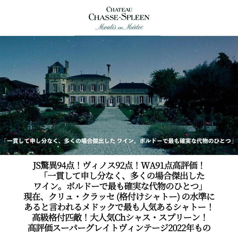 各誌高評価連発!アシェット・ガイド誌でも★★Wスターで大注目!さらにヒュー・ジョンソン氏も「ボルドーの最も確かな代物のひとつ」と激賞する人気シャトーから、平均樹齢30年のカベルネ・ソーヴィニヨン54%、メルロー39%、プティ・ヴェルド5%、カベルネ・フラン2%を手摘み100%!オーク樽18ヶ月熟成(新樽比率40%)の本格派!現在、クリュ・クラッセ(格付けシャトー)の水準にあると言われるメドックでも最も人気のあるシャトーのひとつ!シャス・スプリーンの最新ヴィンテージで高評価スーパーグレイトヴィンテージ[2022]年ものが限定少量入荷!