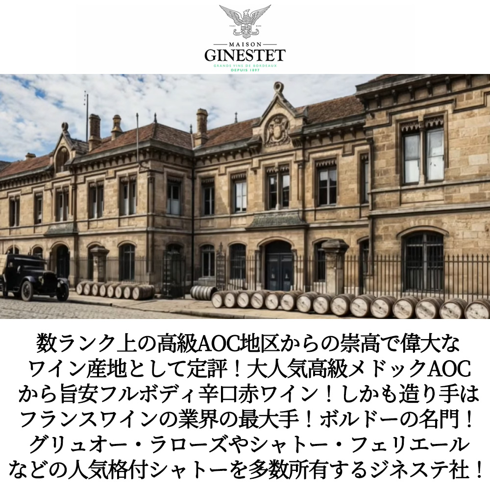 しかも造り手はフランスワインの業界の最大手!ボルドーの名門!グリュオー・ラローズやシャトー・シャス・スプリーン、フェリエール、シトランなどの人気格付シャトーを多数所有していることで知られる1897年にネゴシアンであるフェルナンド・ジネステによって設立されたジネステ社!(タイヤン・グループ(メルロー家)の一員となり、現在はその中核を担っています。)によるメドックAOC!