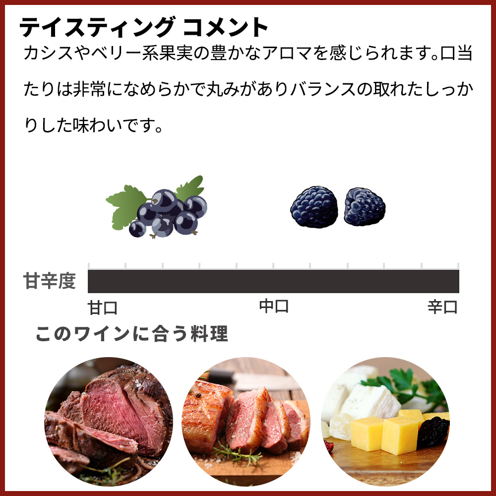 メルロー種とカベルネ・ソーヴィニヨン種で造られるこのワインは、凝縮されたガーネットレッド色の外観に、カシスやベリー系果実の豊かなアロマを感じられます。口当たりは非常になめらかで丸みがありバランスの取れたしっかりした味わいです。グリルした牛肉、鴨の胸肉料理、または上質なチーズと相性抜群です。適温14-16度で!アロマティックな余韻も特徴的な究極フルボディ赤ワイン!