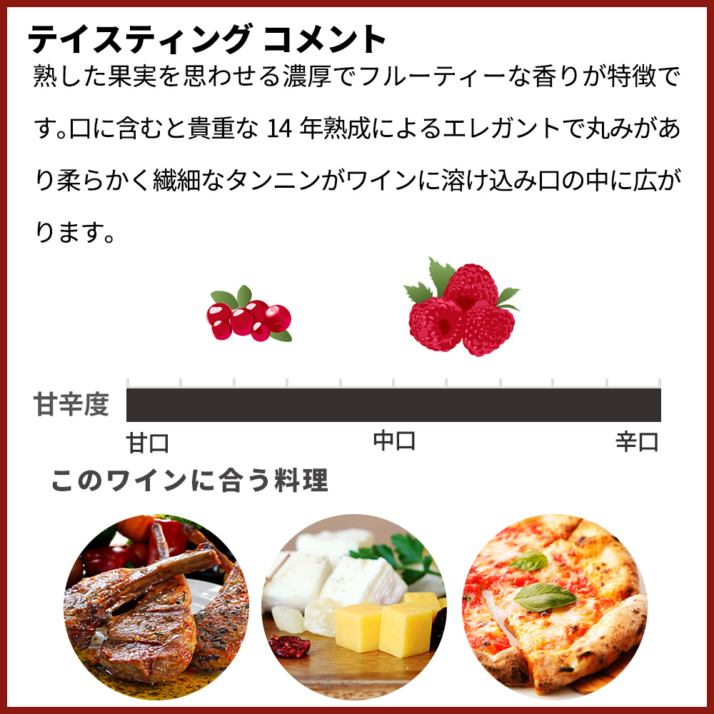 サーロインステーキや肉の煮込み、ハードタイプのチーズとよく合います。適温16-18度、フルボディ(メドックのシンプルで比較的クラシックな組み合わせをお勧めします:赤身肉、ジビエ、熟成チーズ。)