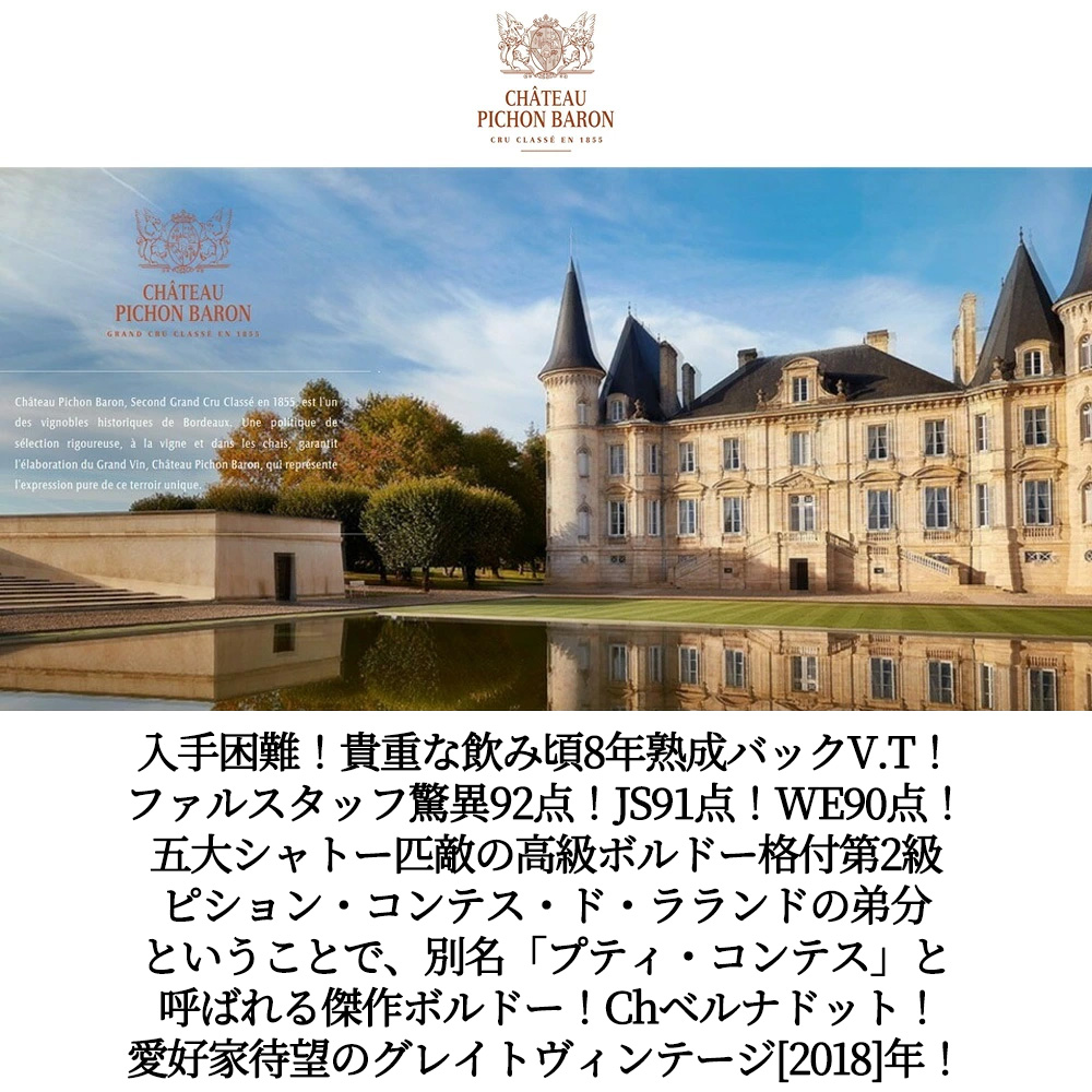 入手困難!ボルドー オー・メドック・フルボディ辛口赤ワイン愛好家大注目!愛好家待望の超グレイトヴィンテージ[2018]年もの!(2018年は、ワインアドヴォケイト誌のヴィンテージチャートにてサンジュリアン、ポイヤック、サンテステフ、マルゴーに96点を付ける素晴らしいヴィンテージ)!スウェーデン王室ご用達!であり、メドック格付第一級のシャトー・ラトゥールやラフィットなどの五大シャトーと張り合い、時には互角に勝負できると言われるスーパー・セカンド!ピション・ロングヴィル・ラランドの運営(2012年からは香港の免税事業などを手掛けるキング・パワー・グループの所有)による大人気オー・メドック!