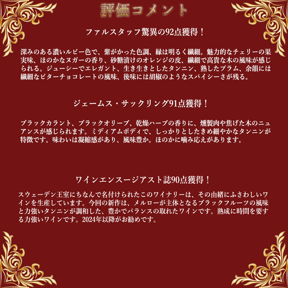ワインエンスージアスト誌90点でコメントは「スウェーデン王室にちなんで名付けられたこのワイナリーは、その由緒にふさわしいワインを生産しています。今回の新作は、メルローが主体となるブラックフルーツの風味と力強いタンニンが調和した、豊かでバランスの取れたワインです。熟成に時間を要する力強いワインです。2024年以降がお勧めです。」!