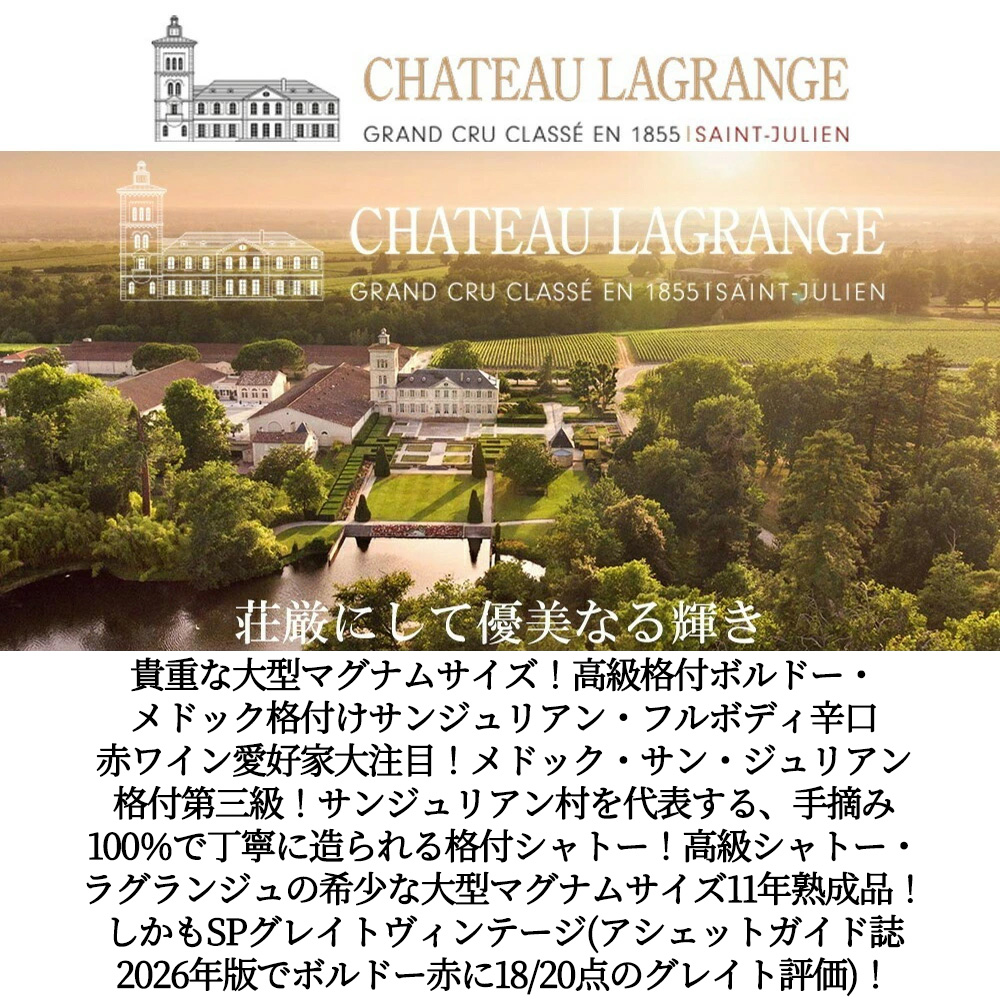 貴重な大型マグナムサイズ!高級格付ボルドー・メドック格付けサンジュリアン愛好家大注目!ボルドー・メドック高級格付大型マグナムサイズフルボディ辛口赤ワイン愛好家大注目!メドック・サン・ジュリアン格付第三級!サンジュリアン村を代表する、手摘み100%で丁寧に造られる格付シャトー!高級シャトー・ラグランジュ!しかもスーパーグレイトヴィンテージ(アシェットガイド誌2026年版でボルドー赤に18/20点のグレイト評価)!厳しい評価で知られるル・クラスマン(現レ・メイユール・ヴァン・ド・フランス)に星付で大注目させ、「特筆に値する厳格なセレクションによって堅牢で色が濃く古典的なメドックのタンニンを持つ実に安定したワイン」と言わしめ高評価を獲得!ミシェル・ベタンヌ&ドゥソーヴの“ル・グラン・ギ・ド・デ・ヴァン・デ・フランス誌”では、「テクスチュアの繊細さと洗練さが増しており、品格の面でも価値の面においても、レオヴィルに近づいている。」と大絶賛!