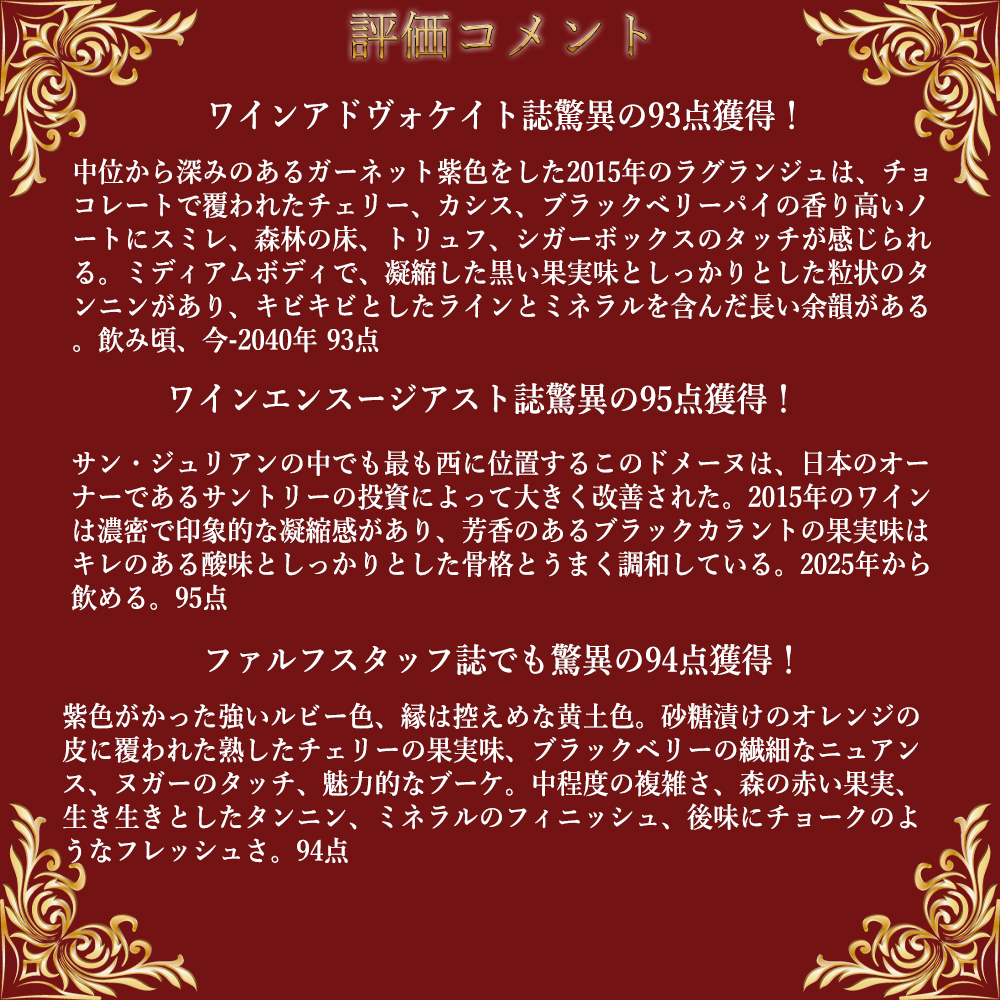 さらにワインエンスージアスト誌驚異の95点獲得!大絶賛コメントは『サン・ジュリアンの中でも最も西に位置するこのドメーヌは、日本のオーナーであるサントリーの投資によって大きく改善された。2015年のワインは濃密で印象的な凝縮感があり、芳香のあるブラックカラントの果実味はキレのある酸味としっかりとした骨格とうまく調和している。2025年から飲める。95点』と大絶賛!