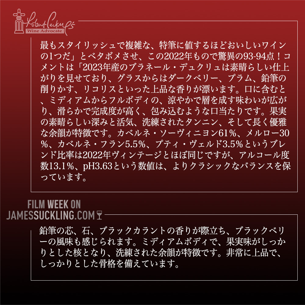 ロバート・パーカー氏は4つ星生産者に挙げ、「最もスタイリッシュで複雑な、特筆に値するほどおいしいワインの1つだ」とベタボメさせ、この2022年もので驚異の93-94点!コメントは「2023年産のブラネール・デュクリュは素晴らしい仕上がりを見せており、グラスからはダークベリー、プラム、鉛筆の削りかす、リコリスといった上品な香りが漂います。口に含むと、ミディアムからフルボディの、涼やかで層を成す味わいが広がり、滑らかで完成度が高く、包み込むような口当たりです。果実の素晴らしい深みと活気、洗練されたタンニン、そして長く優雅な余韻が特徴です。カベルネ・ソーヴィニヨン61%、メルロー30%、カベルネ・フラン5.5%、プティ・ヴェルド3.5%というブレンド比率は2022年ヴィンテージとほぼ同じですが、アルコール度数13.1%、pH3.63という数値は、よりクラシックなバランスを保っています。」と激賞コメント!