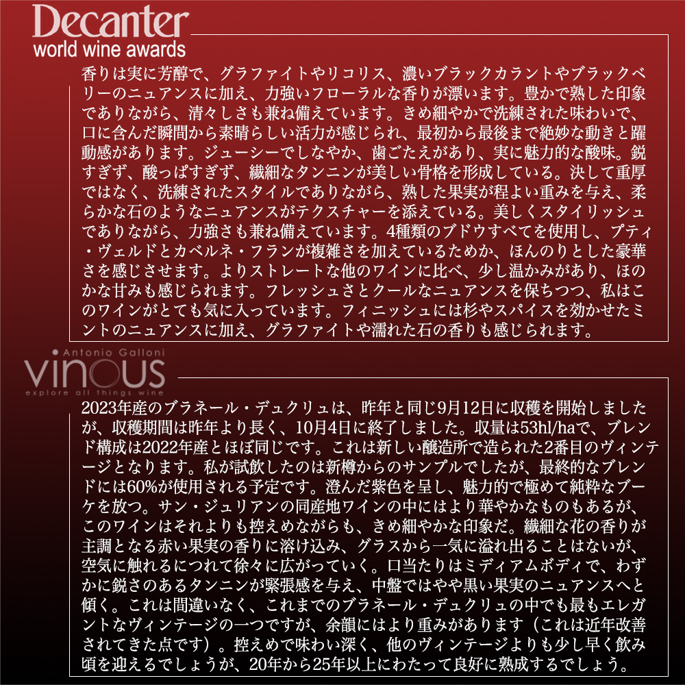 ヴィノス誌も「2023年産のブラネール・デュクリュは、昨年と同じ9月12日に収穫を開始しましたが、収穫期間は昨年より長く、10月4日に終了しました。収量は53hl/haで、ブレンド構成は2022年産とほぼ同じです。これは新しい醸造所で造られた2番目のヴィンテージとなります。私が試飲したのは新樽からのサンプルでしたが、最終的なブレンドには60%が使用される予定です。澄んだ紫色を呈し、魅力的で極めて純粋なブーケを放つ。サン・ジュリアンの同産地ワインの中にはより華やかなものもあるが、このワインはそれよりも控えめながらも、きめ細やかな印象だ。繊細な花の香りが主調となる赤い果実の香りに溶け込み、グラスから一気に溢れ出ることはないが、空気に触れるにつれて徐々に広がっていく。口当たりはミディアムボディで、わずかに鋭さのあるタンニンが緊張感を与え、中盤ではやや黒い果実のニュアンスへと傾く。これは間違いなく、これまでのブラネール・デュクリュの中でも最もエレガントなヴィンテージの一つですが、余韻にはより重みがあります(これは近年改善されてきた点です)。控えめで味わい深く、他のヴィンテージよりも少し早く飲み頃を迎えるでしょうが、20年から25年以上にわたって良好に熟成するでしょう。」と大注目!