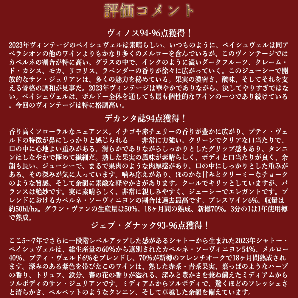 ヴィノス94-96点でコメントは「2023年ヴィンテージのベイシュヴェルは素晴らしい。いつものように、ベイシュヴェルは同アペラシオンの他のワインよりもかなり多くのメルローを含んでいるが、このヴィンテージではカベルネの割合が特に高い。グラスの中で、インクのように濃いダークフルーツ、クレーム・ド・カシス、モカ、リコリス、ラベンダーの香りが徐々に広がっていく。このジューシーで開放的なサン・ジュリアンは、多くの魅力を秘めている。果実の濃密さ、酸味、そしてそれを支える骨格の調和が見事だ。2023年ヴィンテージは華やかでありながら、決してやりすぎではない。ベイシュヴェルは、ボルドー全体を通しても最も個性的なワインの一つであり続けている。今回のヴィンテージは特に格調高い。」!