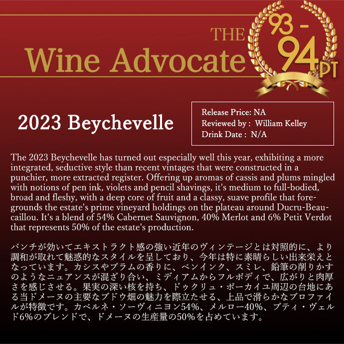 シャトー・ベイシュヴェル[2023]年・メドック・グラン・クリュ・クラッセ・格付第4級・AOCサン・ジュリアン・ワインアドヴォケイト驚異93-94点&ヴィノス94-96点&デカンタ誌94点&ジェブ・ダナック93-96点