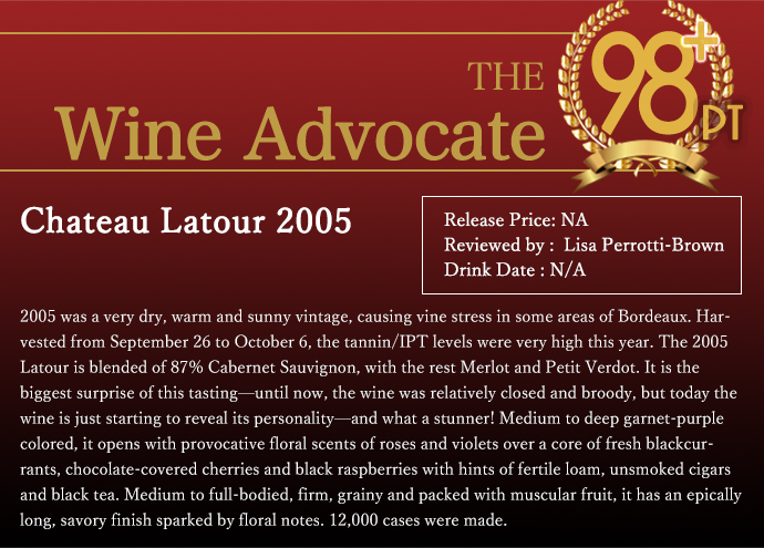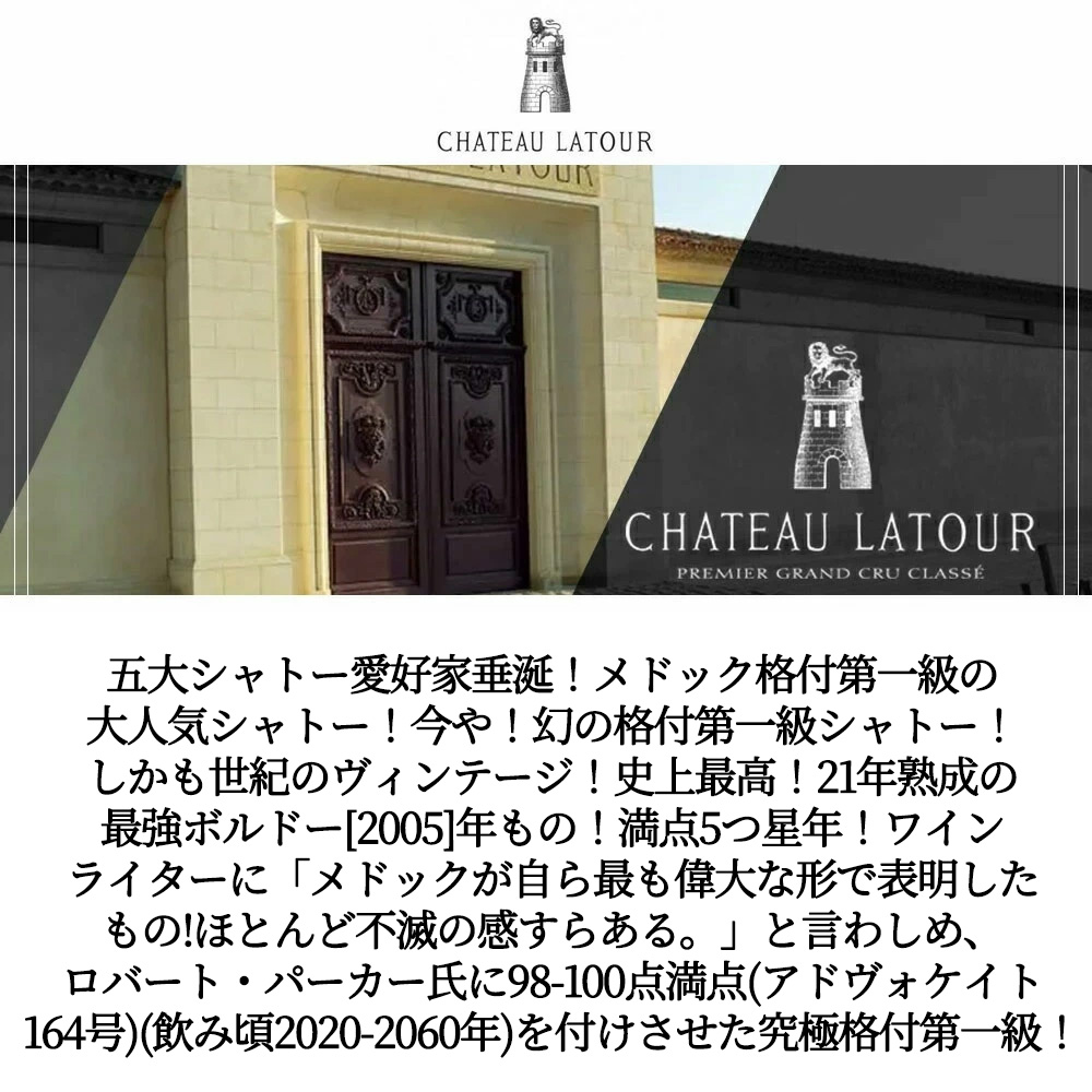 シャトー・ラトゥール[2005]年・メドック・プルミエ・グラン・クリュ・クラッセ・公式格付第1級 AOC ポイヤック・ヴィノス誌驚異の100点満点&W&S誌100点満点&ワインエンスージアスト誌驚異の100点満点&ワインスペクテイター誌驚異の99点&ジェイムスサックリング驚異の99点&ワインアドヴォケイト誌驚異の98+点&RVF誌20/20点の満点獲得・21年熟成品