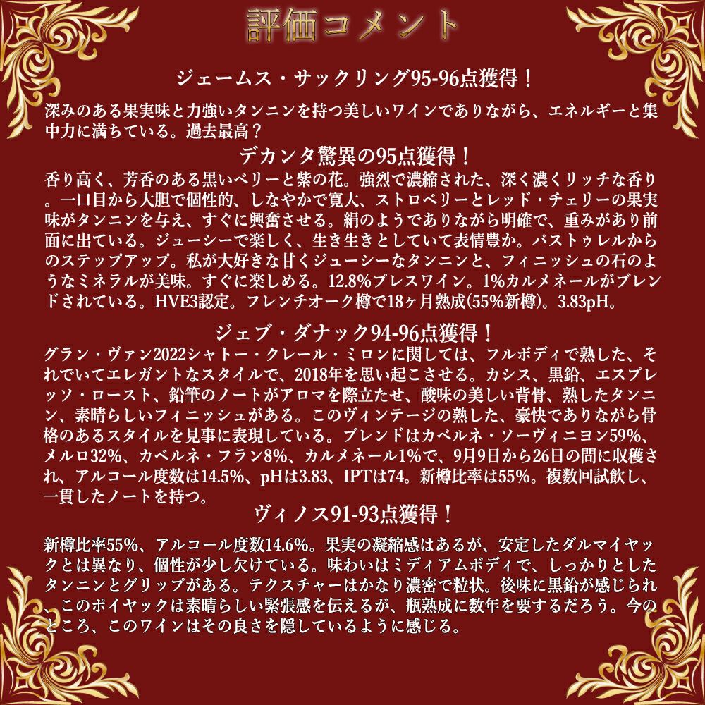 ジェブ・ダナック94-96点でコメントは「グラン・ヴァン2022シャトー・クレール・ミロンに関しては、フルボディで熟した、それでいてエレガントなスタイルで、2018年を思い起こさせる。カシス、黒鉛、エスプレッソ・ロースト、鉛筆のノートがアロマを際立たせ、酸味の美しい背骨、熟したタンニン、素晴らしいフィニッシュがある。このヴィンテージの熟した、豪快でありながら骨格のあるスタイルを見事に表現している。ブレンドはカベルネ・ソーヴィニヨン59%、メルロ32%、カベルネ・フラン8%、カルメネール1%で、9月9日から26日の間に収穫され、アルコール度数は14.5%、pHは3.83、IPTは74。新樽比率は55%。複数回試飲し、一貫したノートを持つ。」!