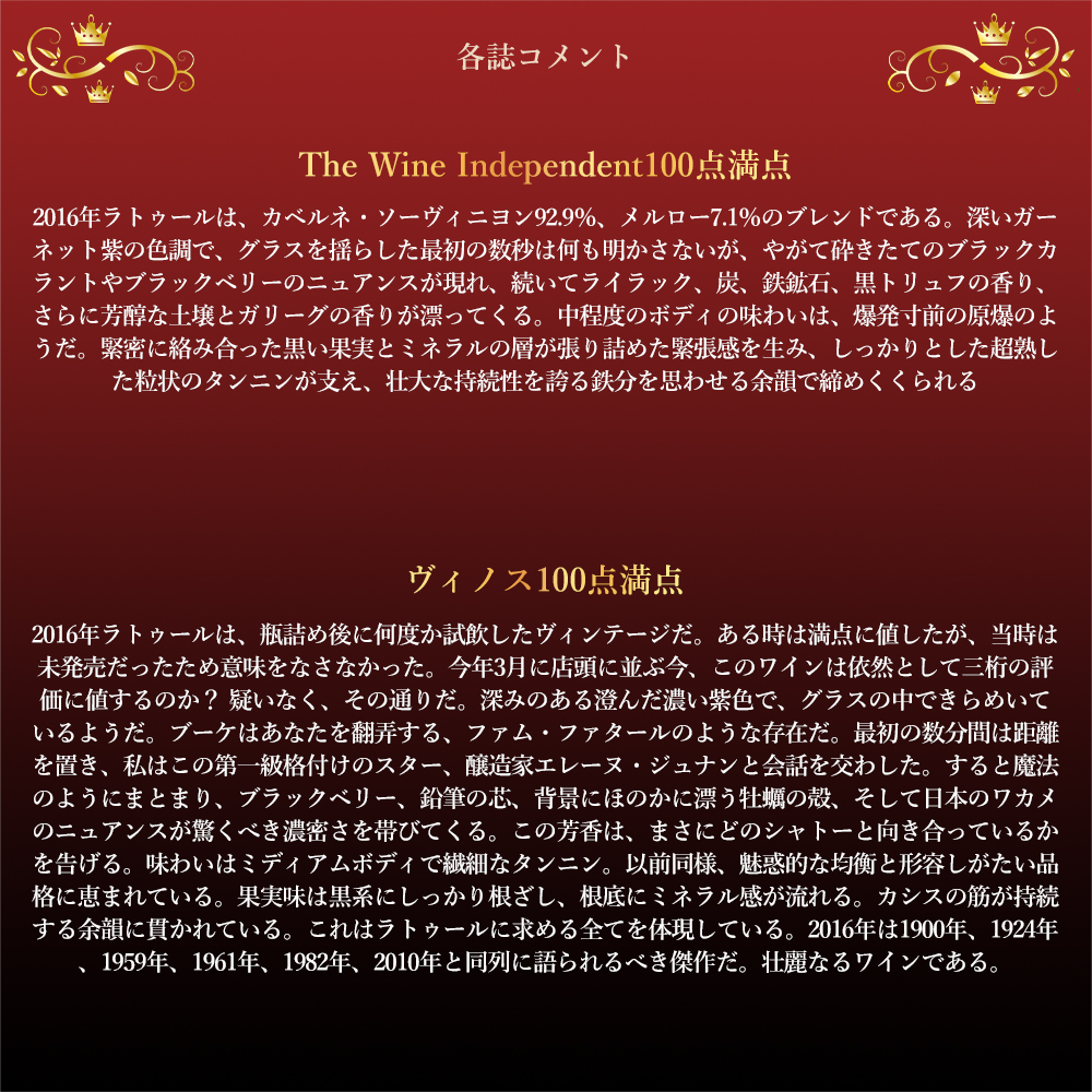 The Wine Independent100点満点でコメントは『2016年ラトゥールは、カベルネ・ソーヴィニヨン92.9%、メルロー7.1%のブレンドである。深いガーネット紫の色調で、グラスを揺らした最初の数秒は何も明かさないが、やがて砕きたてのブラックカラントやブラックベリーのニュアンスが現れ、続いてライラック、炭、鉄鉱石、黒トリュフの香り、さらに芳醇な土壌とガリーグの香りが漂ってくる。中程度のボディの味わいは、爆発寸前の原爆のようだ。緊密に絡み合った黒い果実とミネラルの層が張り詰めた緊張感を生み、しっかりとした超熟した粒状のタンニンが支え、壮大な持続性を誇る鉄分を思わせる余韻で締めくくられる。』!