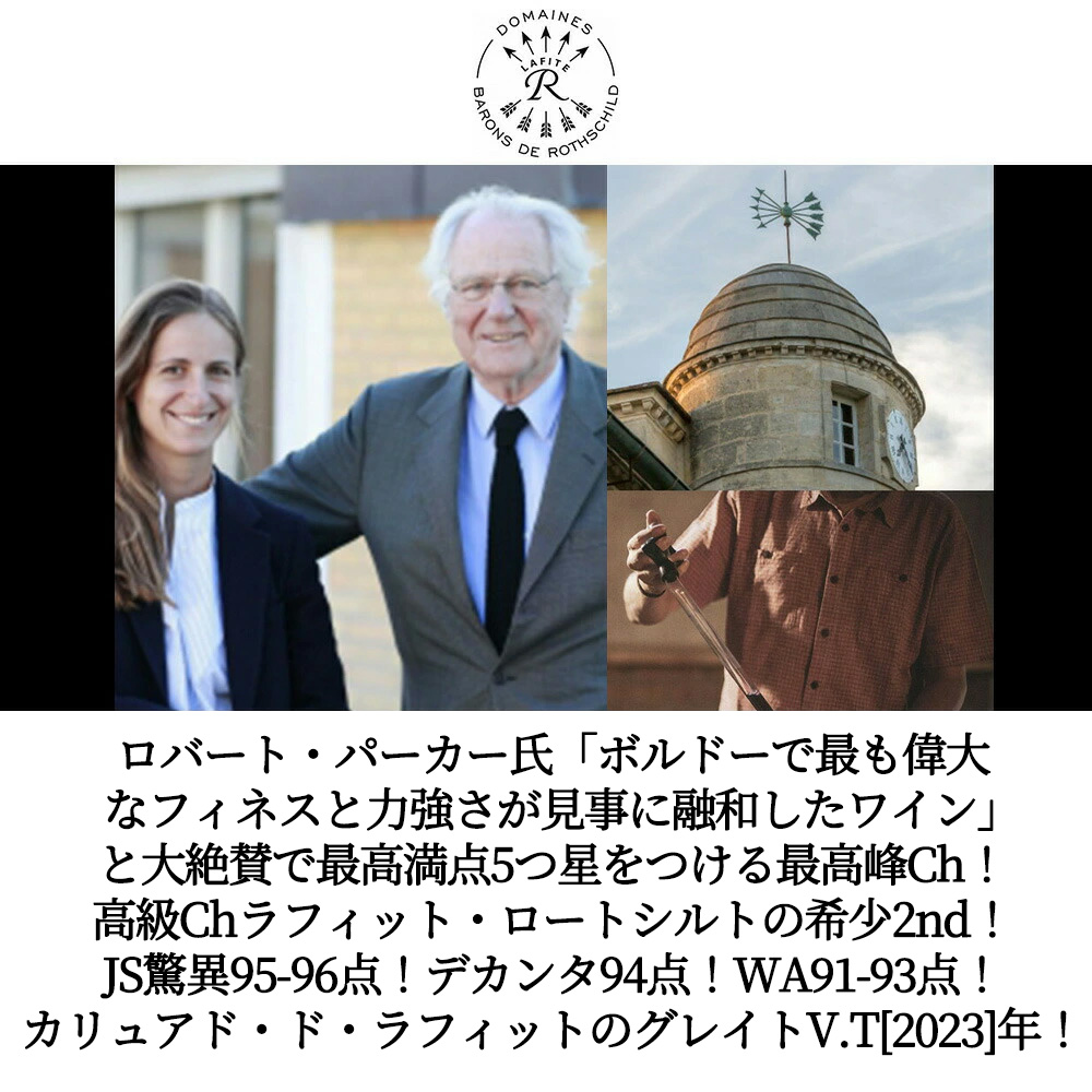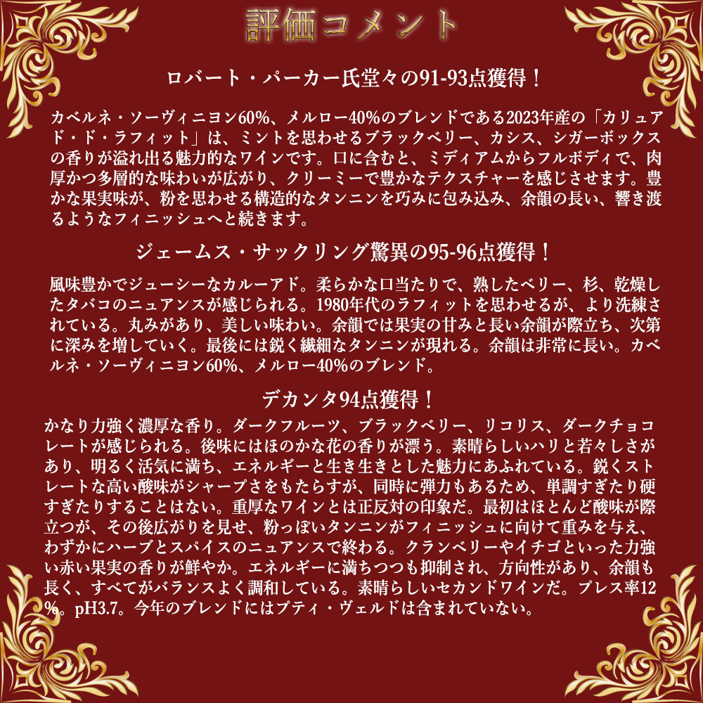 ロバート・パーカー氏に到っては、最高満点5つ星で、「ボルドーで最も偉大なワイン。フィネスと力強さが見事に融和したワイン」と大絶賛し、1stでパーカーポイント97-99点獲得!なんとこの2ndでさえ堂々の91-93点獲得でコメントは「カベルネ・ソーヴィニヨン60%、メルロー40%のブレンドである2023年産の「カリュアド・ド・ラフィット」は、ミントを思わせるブラックベリー、カシス、シガーボックスの香りが溢れ出る魅力的なワインです。口に含むと、ミディアムからフルボディで、肉厚かつ多層的な味わいが広がり、クリーミーで豊かなテクスチャーを感じさせます。豊かな果実味が、粉を思わせる構造的なタンニンを巧みに包み込み、余韻の長い、響き渡るようなフィニッシュへと続きます。」!