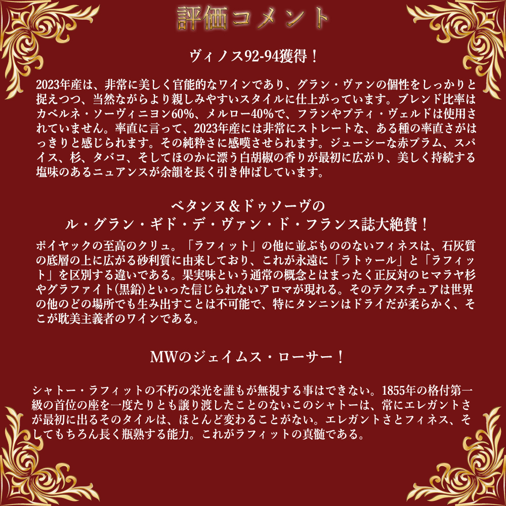 カリュアド・ド・ラフィット[2023]年・シャトー・ラフィット・ロートシルト・メドック・プルミエ・グラン・クリュ・クラッセ・格付第一級・セカンド・ラベル・(ボトルにロットナンバー)・(WA 1st97-99点 2nd 91-93点)&ジェームス・サックリング驚異の95-96点&デカンタ94点&ヴィノス92-94点