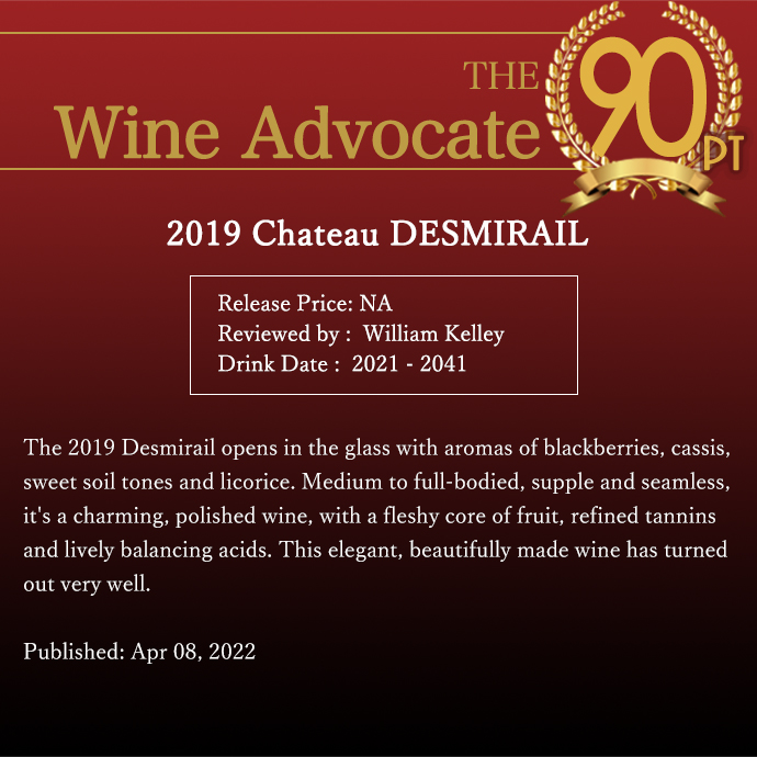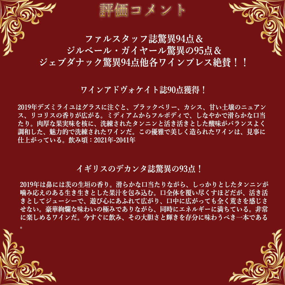 このワインで、ファルスタッフ誌驚異94点&ジルベール・ガイヤール驚異の95点&ジェブダナック驚異94点&イギリスのデカンタ誌驚異の93点他各ワインプレス絶賛!ワインアドヴォケイト誌高評価の絶賛コメントは『2019年デズミライユはグラスに注ぐと、ブラックベリー、カシス、甘い土壌のニュアンス、リコリスの香りが広がる。ミディアムからフルボディで、しなやかで滑らかな口当たり。肉厚な果実味を核に、洗練されたタンニンと活き活きとした酸味がバランスよく調和した、魅力的で洗練されたワインだ。この優雅で美しく造られたワインは、見事に仕上がっている。飲み頃:2021年-2041年』と大注目!