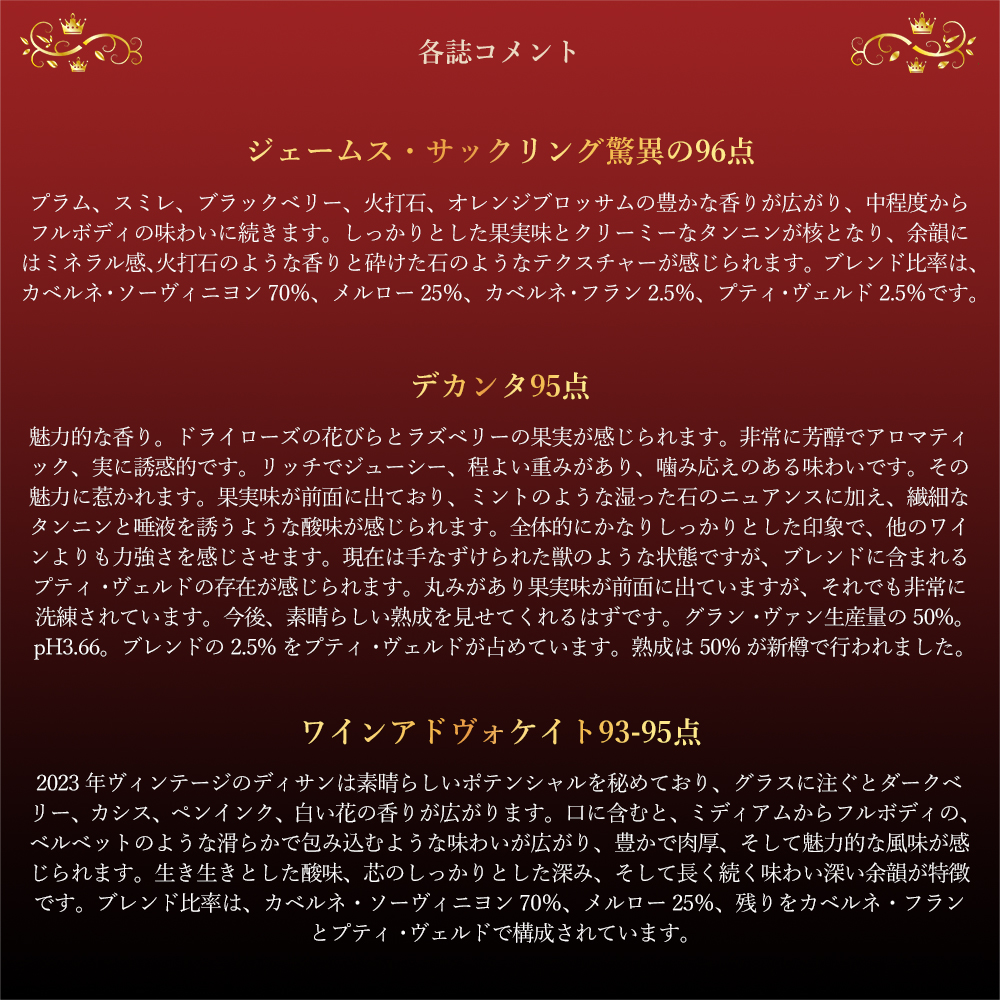 この2023年のディッサンにジェームス・サックリング驚異の96点でコメントは『プラム、スミレ、ブラックベリー、火打石、オレンジブロッサムの豊かな香りが広がり、中程度からフルボディの味わいに続きます。しっかりとした果実味とクリーミーなタンニンが核となり、余韻にはミネラル感、火打石のような香りと砕けた石のようなテクスチャーが感じられます。ブレンド比率は、カベルネ・ソーヴィニヨン70%、メルロー25%、カベルネ・フラン2.5%、プティ・ヴェルド2.5%です。』!