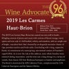 ヴィノス97+点でコメントは「技術ディレクターのギヨーム・プティエは、2019年ヴィンテージの「レ・カルム・オ・ブリオン」でまたしても傑作を世に送り出しました。エレガントで洗練され、芯まで見事なニュアンスに満ちた2019年は、最初の瞬間から輝きを放ちます。房ごと醸造により、カベルネ・フランの多様なニュアンスが際立ち、即座に魅了するワインとなっています。口に含むと、クリーミーでテクスチャー豊かな味わいが広がります。プラム、ブラッドオレンジ、スパイス、モカ、乾燥ハーブが、魅惑的なエキゾチックな風味を添えています。2019年は、ボルドーを愛する人なら誰もが逃したくない、神秘的で完全に魅惑的なワインです。確かに、レ・カルムは典型的なワインからは程遠いですが、極めてユニークです。その熟成ポテンシャルは、数十年に及ぶ可能性が高いでしょう。単純に、私はこのワインが大好きです。」!