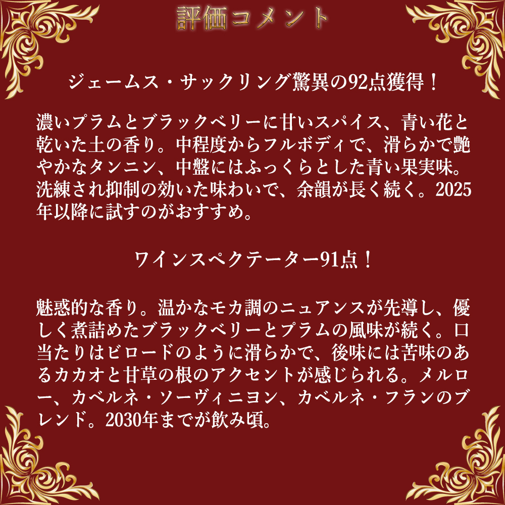 ワインスペクテーター91点でコメントは『魅惑的な香り。温かなモカ調のニュアンスが先導し、優しく煮詰めたブラックベリーとプラムの風味が続く。口当たりはビロードのように滑らかで、後味には苦味のあるカカオと甘草の根のアクセントが感じられる。メルロー、カベルネ・ソーヴィニヨン、カベルネ・フランのブレンド。2030年までが飲み頃。』!