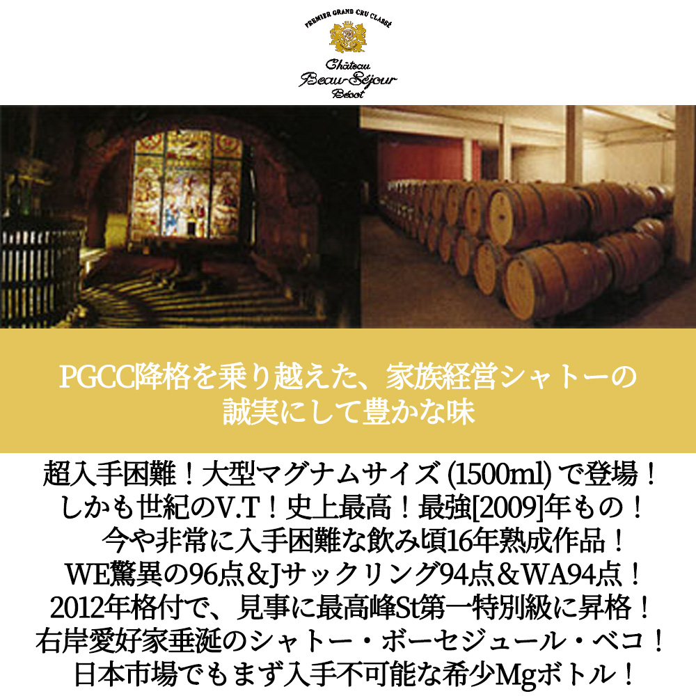 【大型マグナムサイズ】シャトー・ボーセジュール・ベコ[2009]年・AOCサンテミリオン・プルミエ・グラン・クリュ・クラッセ(B)・第一特別級・飲み頃16年熟成作品・ワインエンスージアスト驚異の96点&ジェームス・サックリング94点&ワインアドヴォケイト94点