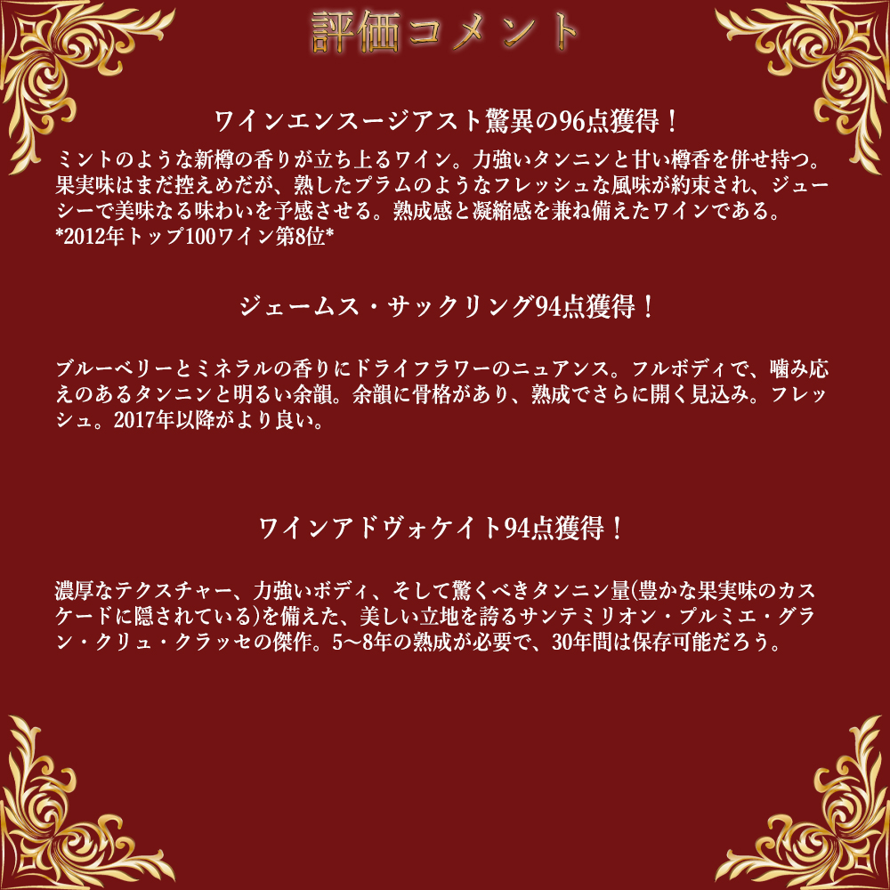 ワインアドヴォケイト94点でコメントは『濃厚なテクスチャー、力強いボディ、そして驚くべきタンニン量(豊かな果実味のカスケードに隠されている)を備えた、美しい立地を誇るサンテミリオン・プルミエ・グラン・クリュ・クラッセの傑作。5~8年の熟成が必要で、30年間は保存可能だろう。』!