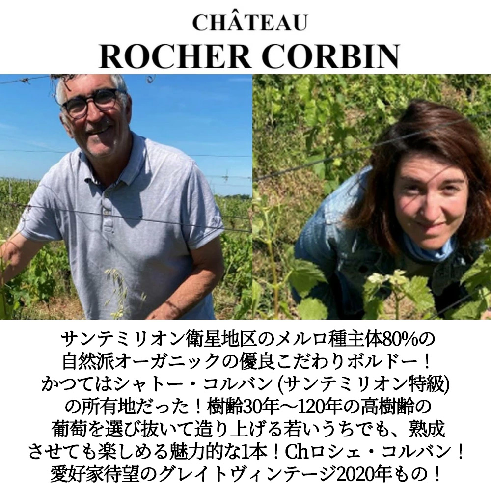 ボルドー・サンテミリオン衛星都市!モンターニュ・サンテミリオンAOC辛口フルボディ赤ワイン愛好家大注目!「ボルドーワイン委員会がおすすめする2026年の顔となるボルドーワイン厳選77本」にこのロシェ・コルバンが選出!しかもサンテミリオン衛星地区のメルロ種主体80%の自然派オーガニックの優良ワイン!しかも家族経営の小規模シャトー (かつてはシャトー・コルバン (サンテミリオン・グラン・クリュ) の所有地であった。) が手掛けるこだわりボルドー (サンテミリオンの衛星都市・AOCモンターニュ・サンテミリオン) から樹齢30年から120年の高樹齢の葡萄を選び抜いて造り上げる若いうちでも、熟成させても楽しめる魅力的な1本!