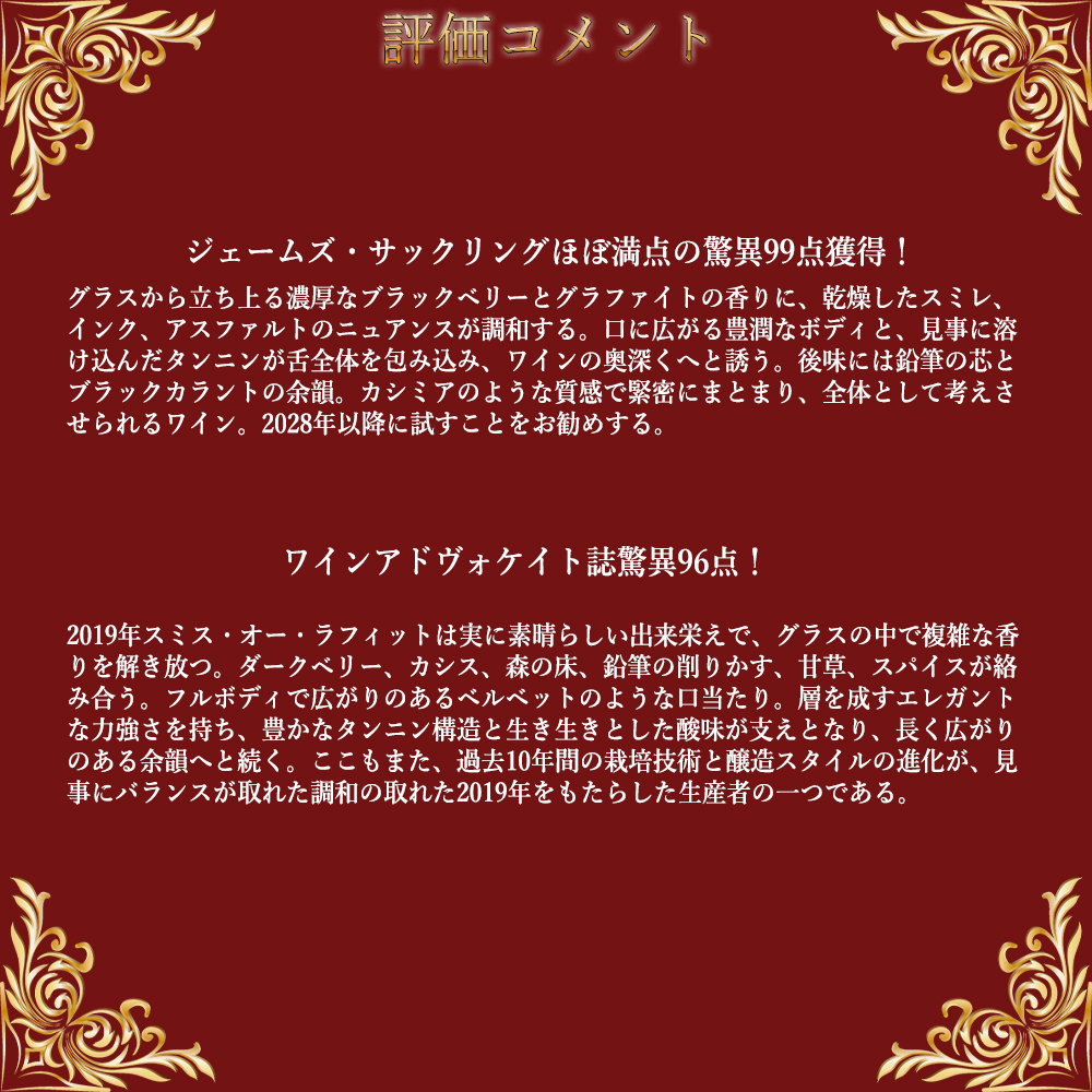 シャトー・スミス・オー・ラフィット・ルージュ[2019]年・オーク樽18ヶ月熟成・グラン・クリュ・クラッセ・ド・グラーヴ(グラーヴ格付(特選格付)・AOCペサック・レオニャン・シャトー元詰・ジェームス・サックリング驚異99点で2022年度のTOP100中、堂々の第4位の快挙(ボルドーのTOP)・ワインアドヴォケイト誌96点!