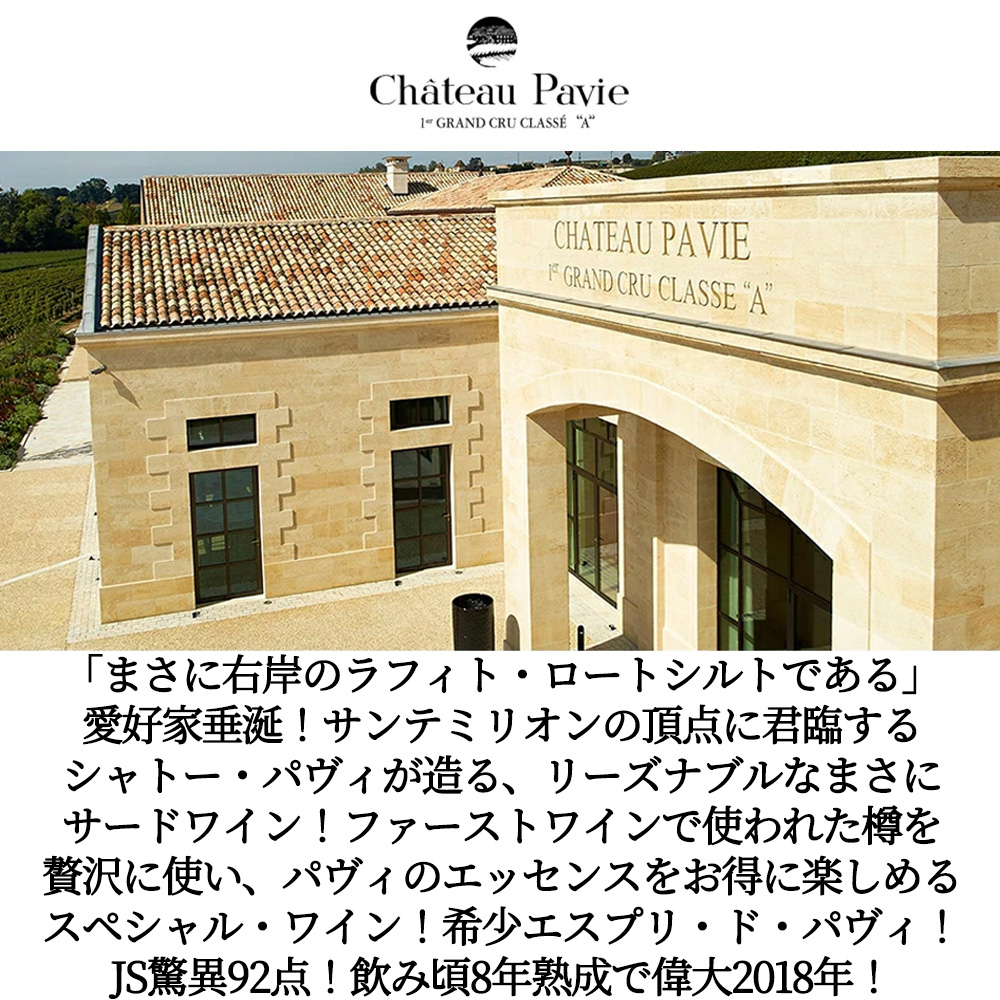 エスプリ・ド・パヴィ[2018]年・シャトー・パヴィ元詰・(ジェラール・ペレス氏・オーナー)・サンテミリオン・プルミエ・グラン・クリュ・クラッセ・第一特別級のサードワイン・飲み頃8年熟成・AOCボルドー・ジェームス・サックリング驚異の92点