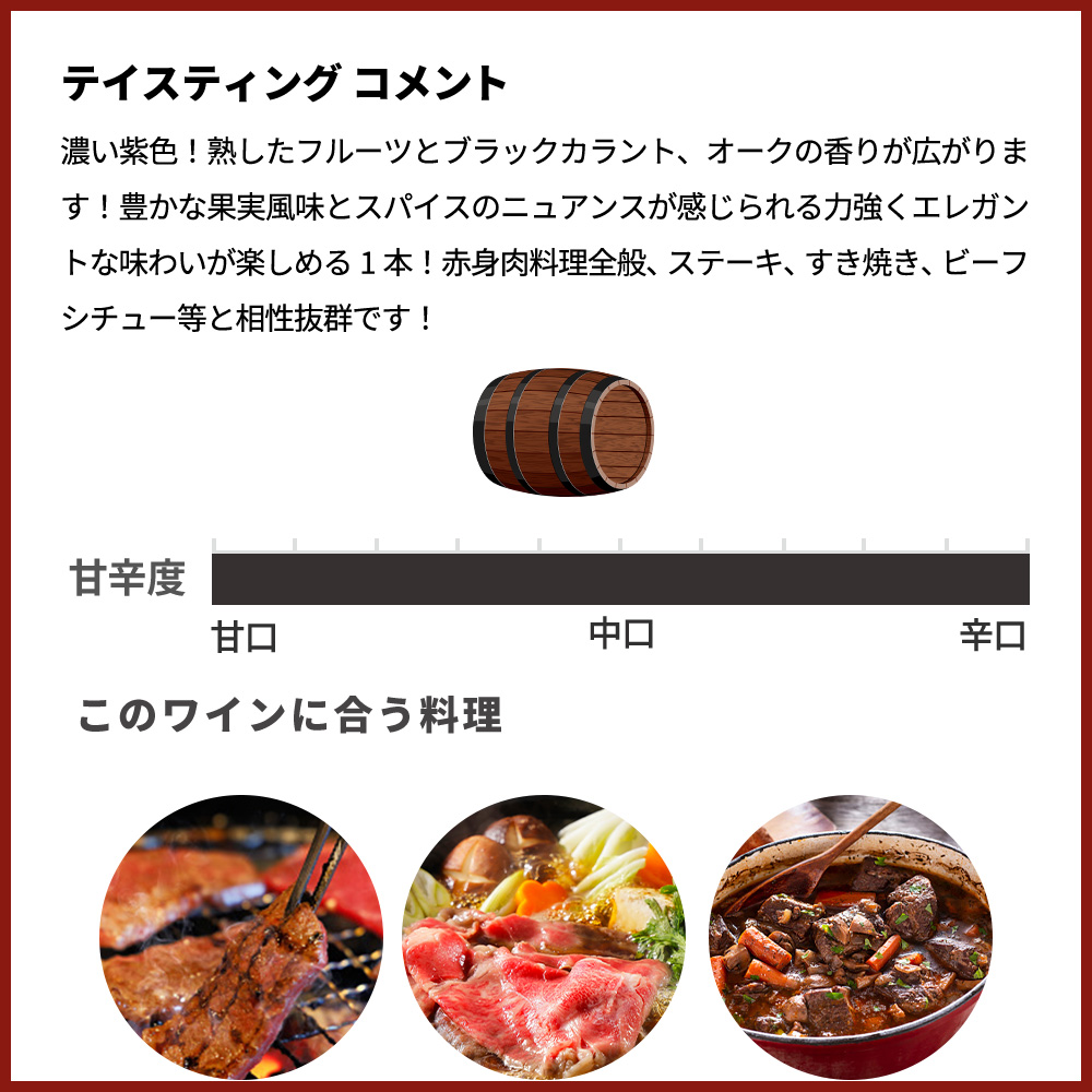 - ブドウ品種メルロー53%、マルベック35%、カベルネ・ソーヴィニヨン12%