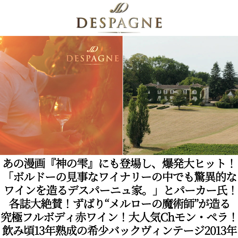 ボルドー辛口フルボディ赤ワイン愛好家垂涎!モンペラファン大注目!あの漫画『神の雫』にも登場!の爆発大ヒットワイン(登場V.Tは'01と'05)!のモン・ペラの希少バックヴィンテージ[2013]年ものが超限定入荷!2013年は難しいV.Tながら、さすがデスパーニュ家貫禄の出来映えで、素晴らしい品質!