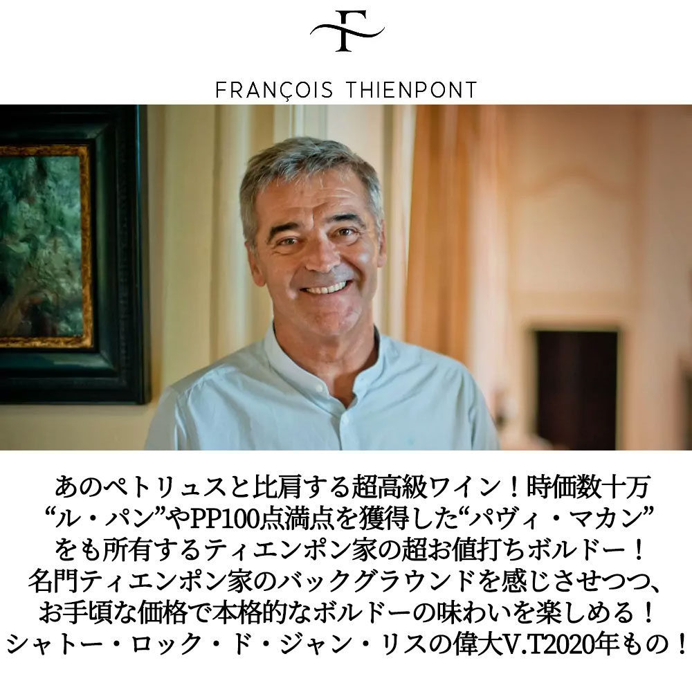 造り手は、あのペトリュスと比肩する超高級ワイン!時価数十万“ル・パン”やPP100点満点を獲得した“パヴィ・マカン”をも所有するティエンポン家!あの「神の雫」でも登場で話題に!フランソワ・ティエンポンは、フランス・ボルドー右岸で名高いティエンポン家の一員で、伝統的なワイン造りのスペシャリスト!ティエンポン家は19世紀からワインに関わるベルギー系の家系で、現在はヴュー・シャトー・セルタンやル・パン、パヴィ・マカン等を所有!こうした名門のノウハウを活かしつつ、比較的手頃な価格で楽しめるボルドーワインをリリースするフランソワ・ティエンポンの渾身作!“シャトー・ロック・ド・ジャン・リス・キュヴェ・フランソワ・ティエンポン”!