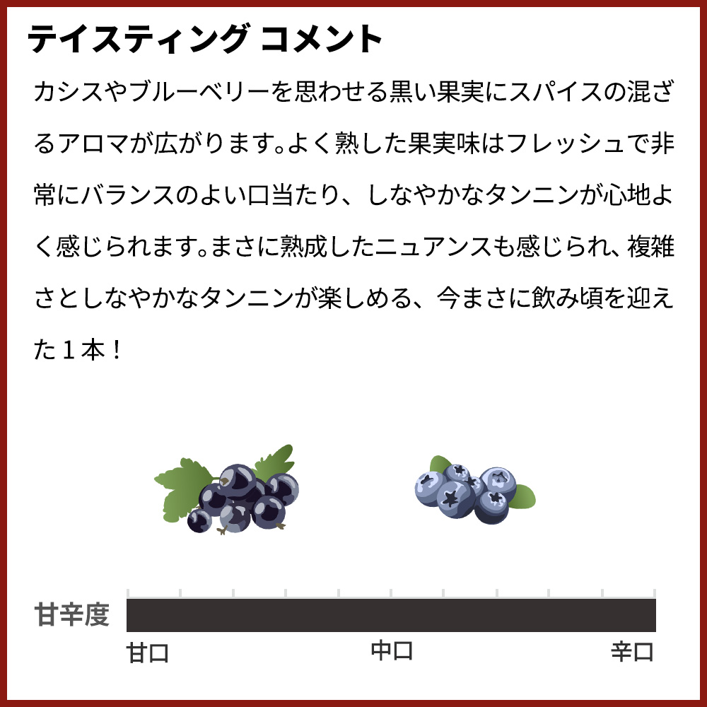 「ブルディコット」はガスコーニュの言葉で小さな農園を意味します。カシスやブルーベリーを思わせる黒い果実にスパイスの混ざるアロマが広がります。よく熟した果実味はフレッシュで非常にバランスのよい口当たり、しなやかなタンニンが心地よく感じられます。まさに熟成したニュアンスも感じられ、複雑さとしなやかなタンニンが楽しめる、今まさに飲み頃を迎えた1本!ぜひ、お楽しみ下さい。