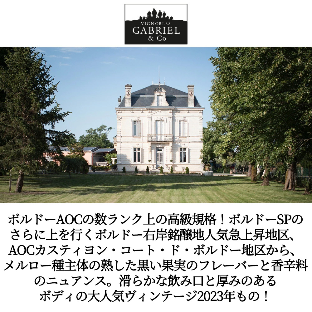 ボルドー銘醸地人気急上昇フルボディ辛口赤ワイン愛好家大注目!ボルドーAOCの数ランク上の高級規格!ボルドーSPのさらに上を行く急上昇地区、AOCカスティヨン・コート・ド・ボルドー地区から、大人気ヴィンテージ2023年もの!でチャイナワインコンクール2024年、ジャパンワインコンクール2024年 、ロンドンワインコンクール2024年金賞受賞のトリプル3冠ゴールドメダル(金賞)受賞酒!