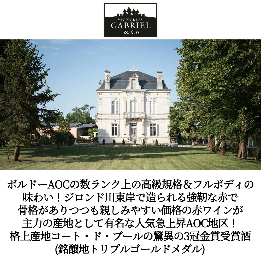 ボルドー銘醸地人気急上昇注目AOC地区辛口赤ワイン愛好家大注目!ボルドーAOCの数ランク上の高級規格&フルボディの味わい!ジロンド川東岸で造られる強靭な赤として有名な人気急上昇AOC地区!AOCコート・ド・ブール! (コート・ド・ブールは、ボルドー右岸ジロンド河沿いのブール村を中心としたAOCで、骨格がありつつも親しみやすい価格の赤ワインが主力の産地です。赤ワインが生産量の約98%を占め、しっかりした骨格を備えつつも、グラーヴに似たフィネスとエレガンスを持ち、色調が濃く、まろやかでフルーティ、きめ細かなタンニンとビロードのような口当たりを特徴。) から3つのコンクールで金賞 (ジャパンアワード 2024金賞、ロンドンアワード2024金賞、チャイナアワード2024金賞) を受賞したボルドー格上産地のフルボディ辛口3冠金賞受賞ワイン!
