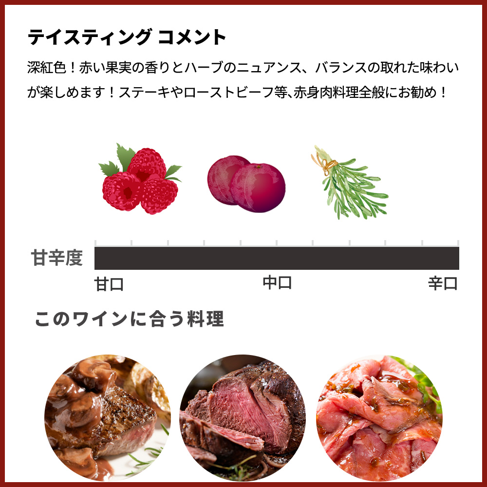 深紅色!赤い果実の香りとハーブのニュアンス、バランスの取れた味わいが楽しめます!ステーキやローストビーフ等、赤身肉料理全般にお勧め!適温:16-18度