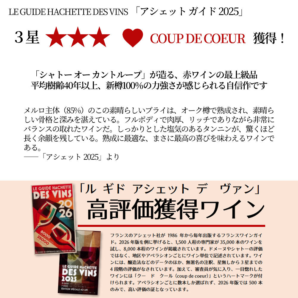 フランス・ボルドー人気急上昇地区フルボディ辛口赤ワイン愛好家大注目!ボルドーAOCの数ランク上の人気急上昇高級AOC地区!ブライAOC!からアシェットガイド誌2025年版で満点3つ星★★★&クープドクール (ハートに一撃) 獲得!赤ワイン!しかも世紀のヴィンテージ!最高!最強ボルドー[2022]年もの! (ワインアドヴォケイト誌ではボルドー右岸のポムロール、サンテミリオン両方に驚異の95点の最高ヴィンテージ!)A.O.C.ブライで造る、上位クラス!新樽を使い、15ヶ月熟成させた上質な1本!