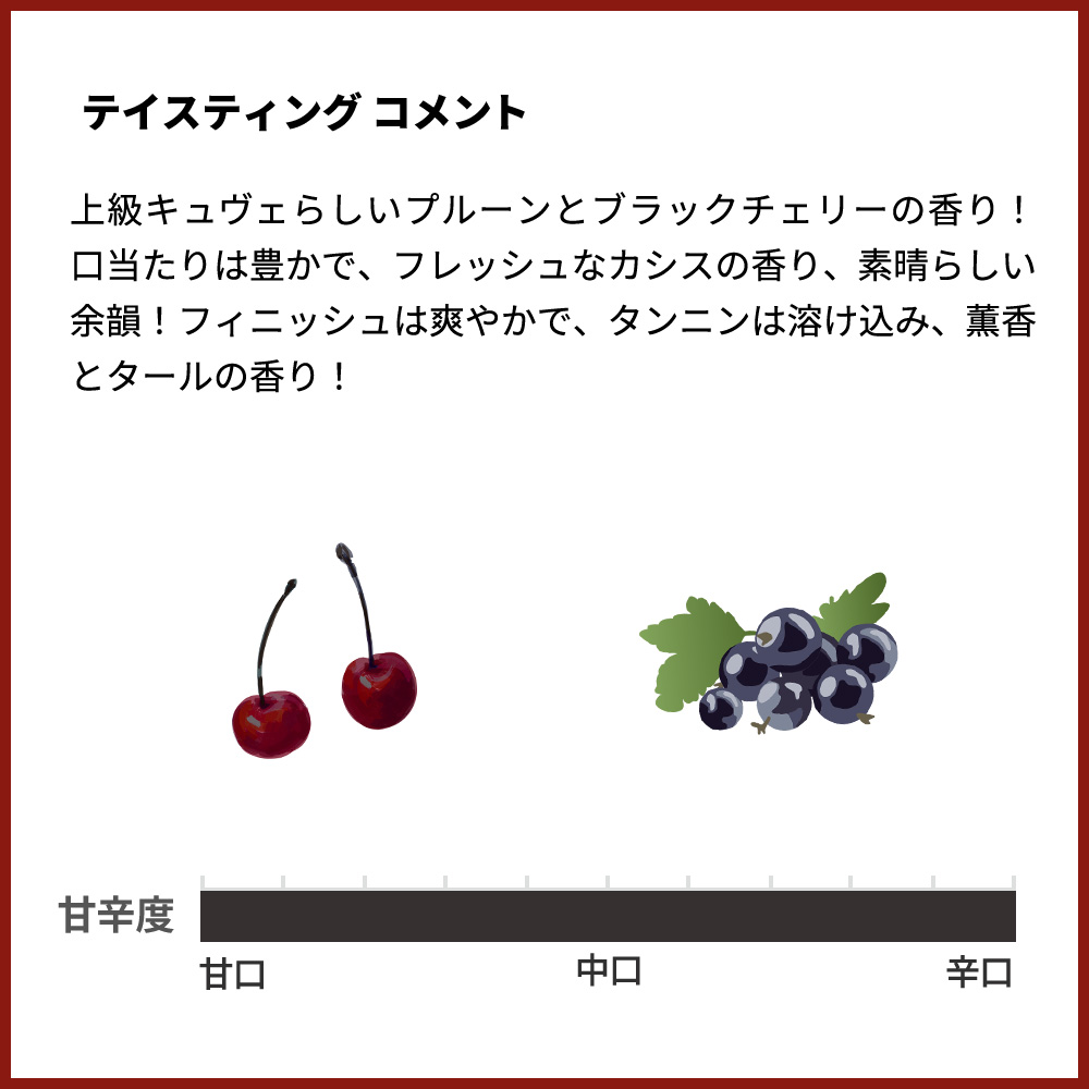 このワインは2003年から造っています!畑はフール村の1haの区画です!土壌は粘土石灰質、葡萄の平均樹齢は40年以上、栽植密度は6,000本/haです!収穫は機械で行います!アルコール発酵は28度に温度管理しながら行います!発酵と醸しの期間は3週間です!熟成はオーク樽で15ヶ月、100%新樽を使用します!上級キュヴェらしいプルーンとブラックチェリーの香り!口当たりは豊かで、フレッシュなカシスの香り、素晴らしい余韻!フィニッシュは爽やかで、タンニンは溶け込み、薫香とタールの香り!