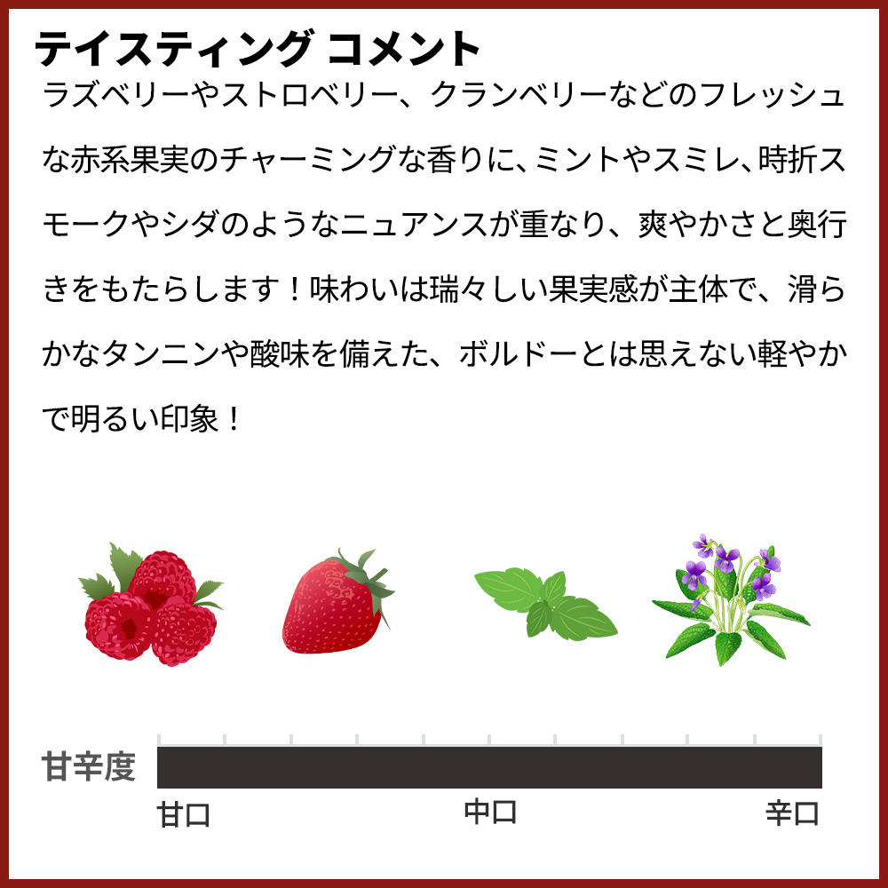外観は紫がかったルビーレッドの色調!ラズベリーやストロベリー、クランベリーなどのフレッシュな赤系果実のチャーミングな香りに、ミントやスミレ、時折スモークやシダのようなニュアンスが重なり、爽やかさと奥行きをもたらします!味わいは瑞々しい果実感が主体で、滑らかなタンニンや酸味を備えた、ボルドーとは思えない軽やかで明るい印象!中盤にはビルベリーやわずかな土っぽさも加わり、複雑さとエレガンスが共存している仕上がり!ワインの最大の特徴であるフレッシュ感を最大限に味わうため、8~10°Cほどに冷やし楽しむのがおすすめ!