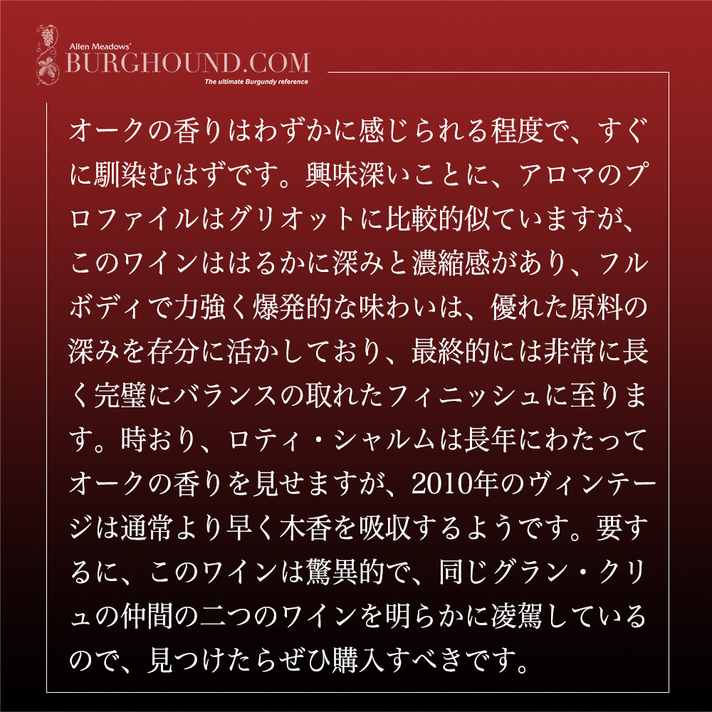 今やパーカーを凌駕する勢いのアラン・メドゥのバーガウンド・ドット・コムでこの年のジョセフ・ロティの最高級を驚異の95点で第絶賛!大絶賛コメントは『オークの香りはわずかに感じられる程度で、すぐに馴染むはずです。興味深いことに、アロマのプロファイルはグリオットに比較的似ていますが、このワインははるかに深みと濃縮感があり、フルボディで力強く爆発的な味わいは、優れた原料の深みを存分に活かしており、最終的には非常に長く完璧にバランスの取れたフィニッシュに至ります。時おり、ロティ・シャルムは長年にわたってオークの香りを見せますが、2010年のヴィンテージは通常より早く木香を吸収するようです。要するに、このワインは驚異的で、同じグラン・クリュの仲間の二つのワインを明らかに凌駕しているので、見つけたらぜひ購入すべきです。95点』と大絶賛!