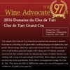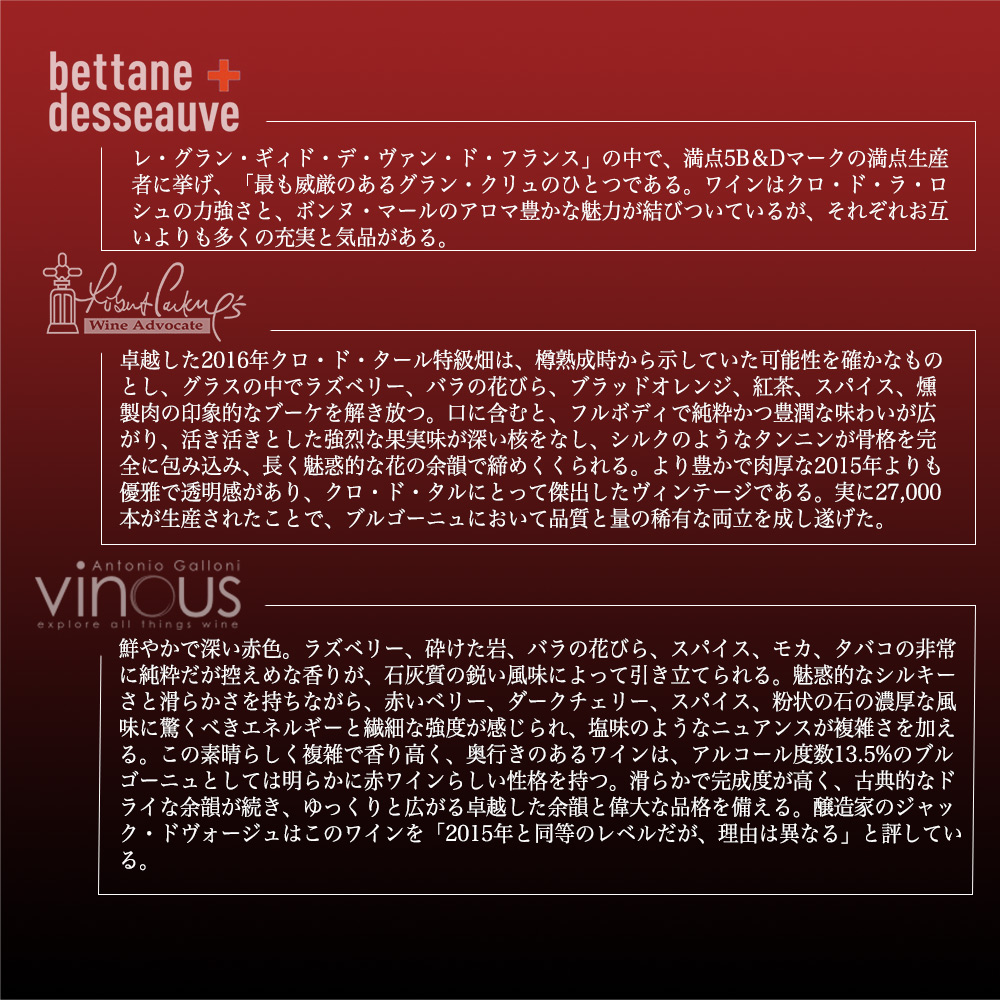 ワインアドヴォケイト誌でも過去指折りの驚異の97点でコメントは『卓越した2016年クロ・ド・タール特級畑は、樽熟成時から示していた可能性を確かなものとし、グラスの中でラズベリー、バラの花びら、ブラッドオレンジ、紅茶、スパイス、燻製肉の印象的なブーケを解き放つ。口に含むと、フルボディで純粋かつ豊潤な味わいが広がり、活き活きとした強烈な果実味が深い核をなし、シルクのようなタンニンが骨格を完全に包み込み、長く魅惑的な花の余韻で締めくくられる。より豊かで肉厚な2015年よりも優雅で透明感があり、クロ・ド・タルにとって傑出したヴィンテージである。実に27,000本が生産されたことで、ブルゴーニュにおいて品質と量の稀有な両立を成し遂げた。』