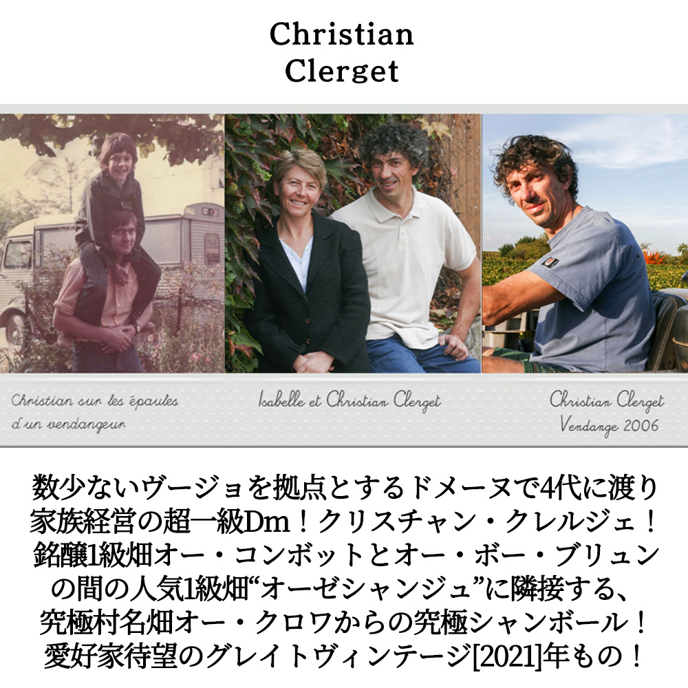 アシェット・ガイド誌ではドゥニ・モルテ、アミオ・セルヴェル、ギスレーヌ・バルトを押さえ、3つ星とクープ・ド・クールをダブル受賞した超一級ドメーヌ!しかもドメーヌ・クリスチャン・クレルジェは数少ないヴージョを拠点とするドメーヌで4代にわたり家族で営んでいます!1876年にポール・クレルジェとジャンヌ・モンジャールによって設立!現在はクリスチャンと妻のイザベルが担っており、2013年から子供達もドメーヌに参画!