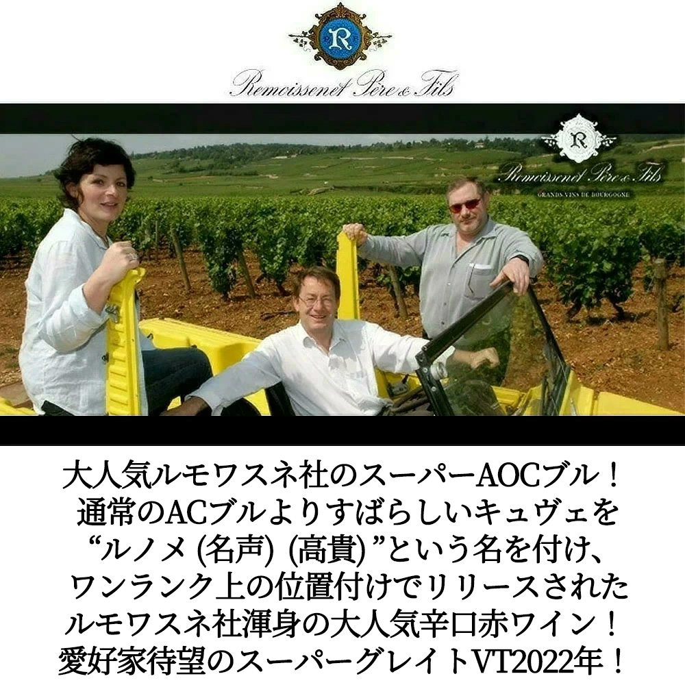しかも造り手は、1877年創立、偉大な地下カーヴに豊富な古酒在庫を持ち、飲み頃になった古酒を蔵出し状態で提供することで有名なルモワスネ社!しかも通常のAOCブルよりすばらしいキュヴェを“ルノメ (名声) ”という名を付け、ワンランク上の位置付けでリリースされた人気辛口赤ワイン!ジャンシス・ロビンソン女史大注目!